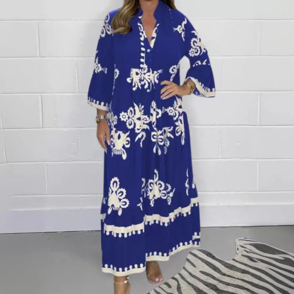 Ontdek de Lisette Elegante lange jurk voor dames, die vrouwelijke charme en tijdloze elegantie naadloos combineert. Deze prachtige jurk heeft een flatterende V-hals die je decolleté elegant accentueert. Het gedetailleerde bloemenpatroon in levendige blauwe en witte accenten geeft elke gelegenheid een frisse lentetouch.