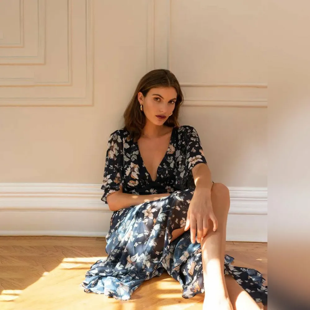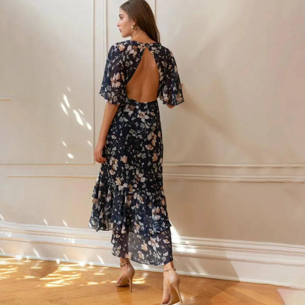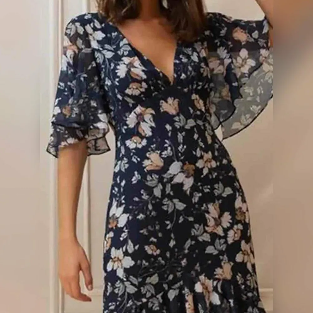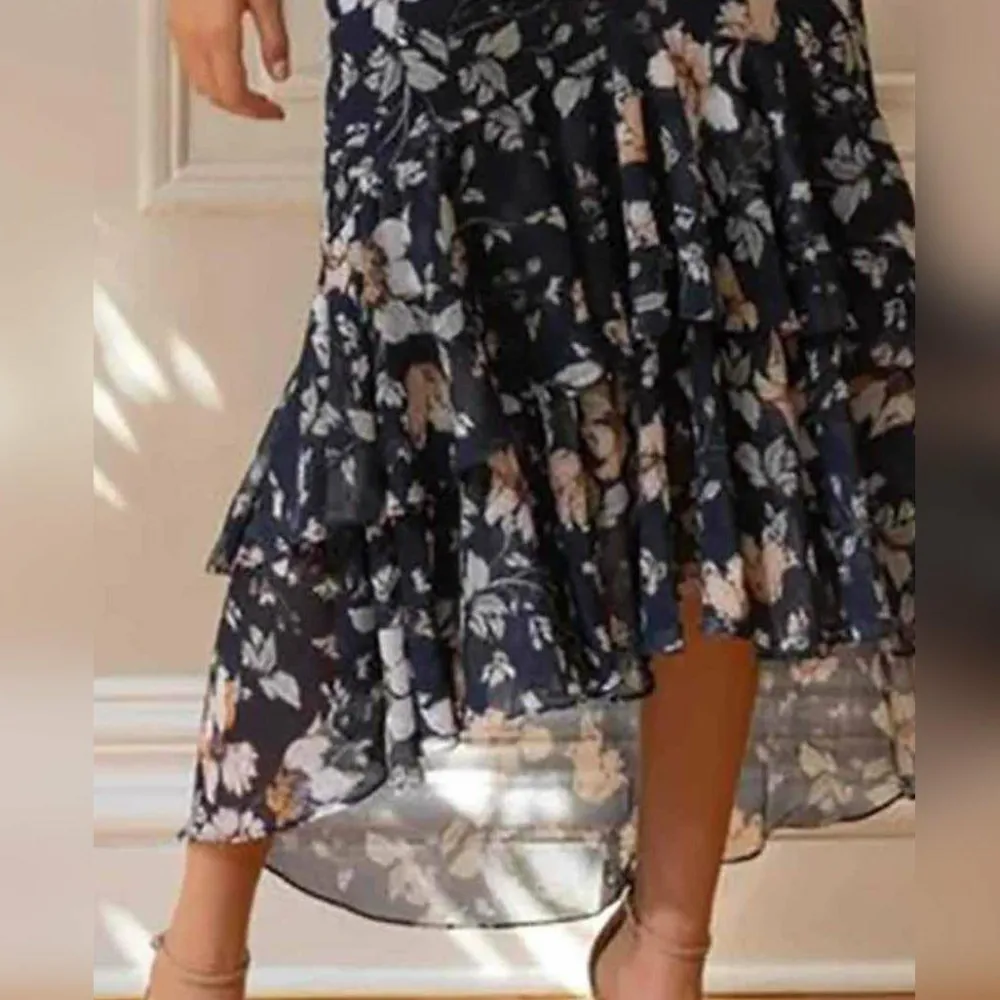 Het bloemenpatroon geeft een grillig en romantisch gevoel, perfect voor zonnige dagen en tuinfeestjes. De hoge rand voegt een speels element toe aan het ontwerp, terwijl de V-hals je vrouwelijkheid accentueert. Met de halve mouwen biedt de jurk de juiste bedekking zonder dat dit ten koste gaat van het ademend vermogen.