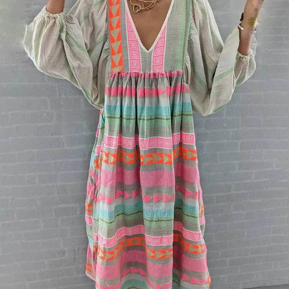 Waar je ook heengaat, deze lange jurk met pofmouw zorgt ervoor dat je in het middelpunt van de belangstelling staat en tovert een glimlach op je gezicht. Met zijn unieke, opvallende patroon. Hij is goed gemaakt en heeft een diepe V-hals. Draag hem met je favoriete sandalen!