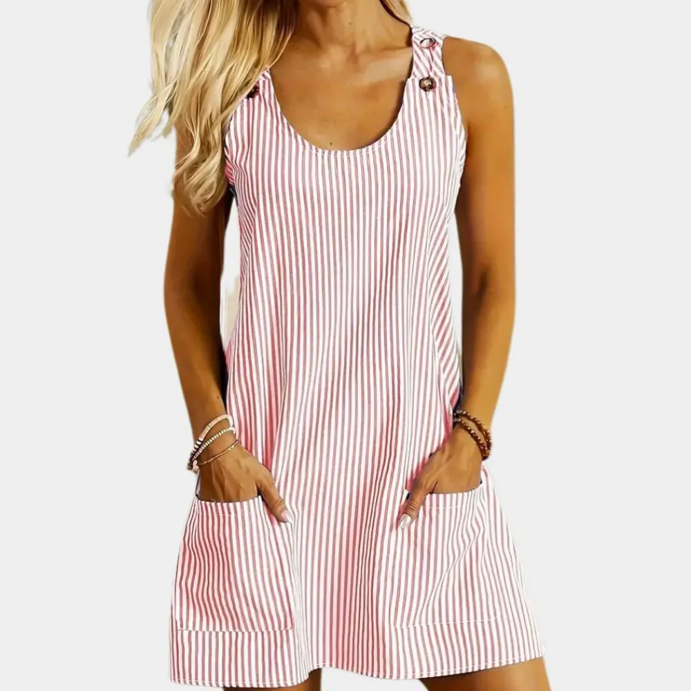 De Modieuze gestreepte damesjurk is zorgvuldig vervaardigd uit hoogwaardige materialen om duurzaamheid en comfort te garanderen. Met zijn slanke pasvorm combineert deze jurk moeiteloos verfijning met alledaags gemak. Het tijdloze streeppatroon voegt een vleugje elegantie toe aan elk ensemble, terwijl de praktische zakken gemak bieden zonder stijl op te offeren. Upgrade je garderobe met dit veelzijdige stuk dat perfect is voor zowel werk als casual activiteiten.