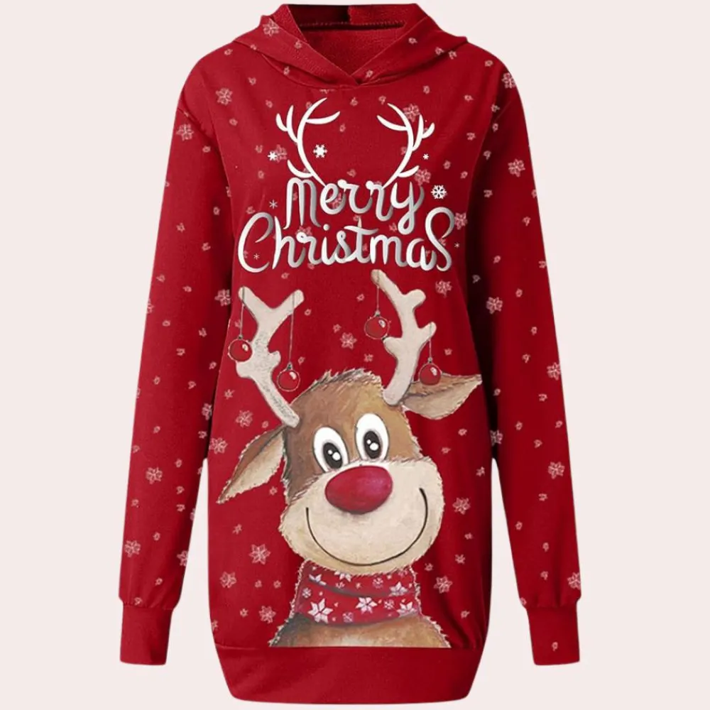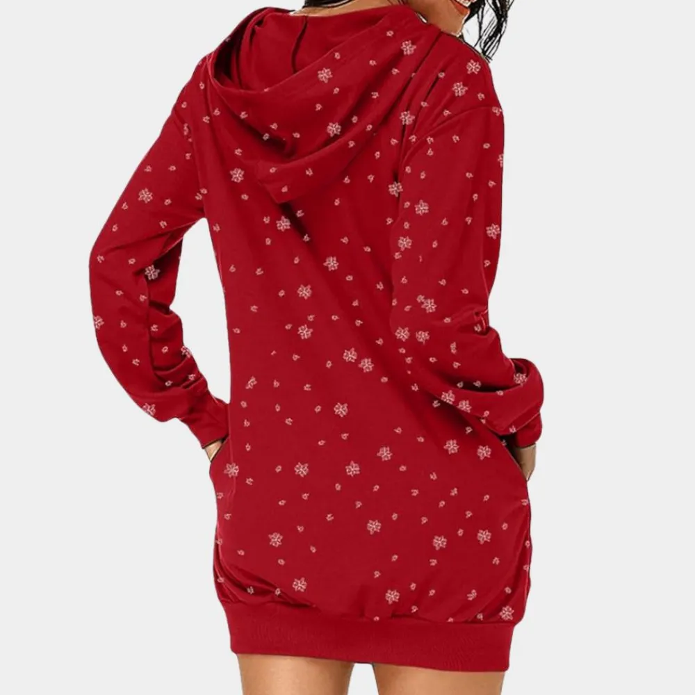 Met zijn capuchonontwerp en losse pasvorm is deze jurk perfect voor bijeenkomsten, feestelijke uitjes of gewoon om in casual stijl van het seizoen te genieten. De speelse feestdetails maken het een opvallend item in je seizoenscollectie.