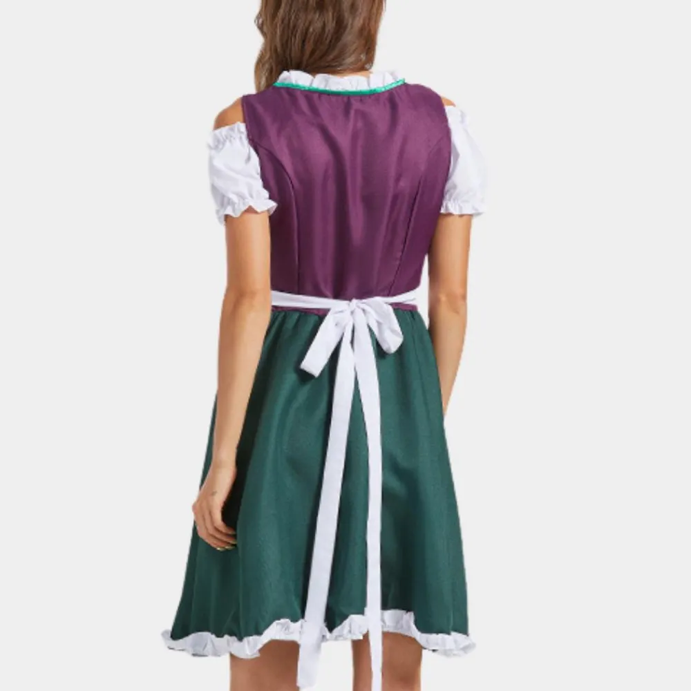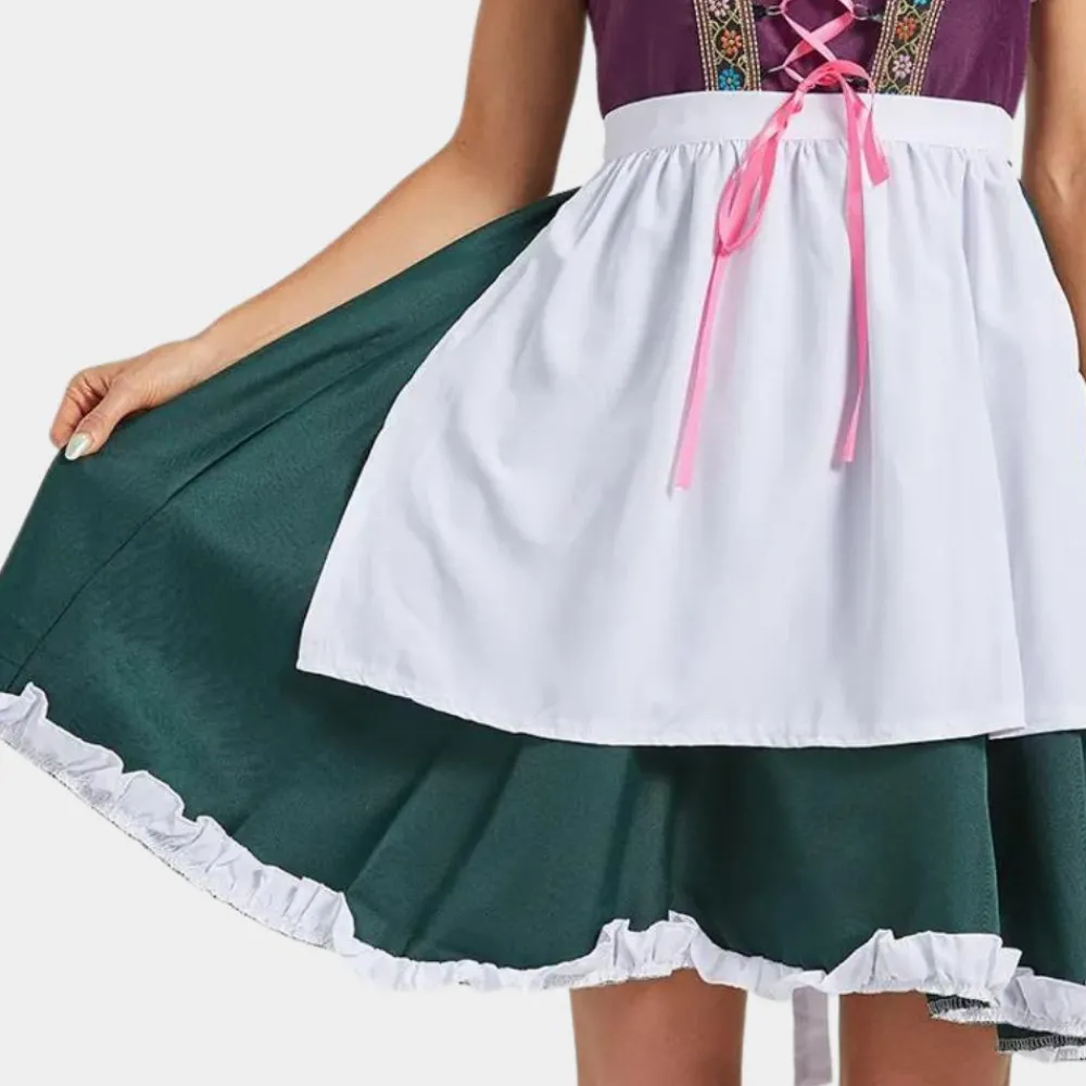 Het schort, dat elegant in de taille wordt gestrikt, voegt een vleugje gratie toe en maakt deze jurk perfect voor feestelijke gelegenheden zoals Oktoberfest, themafeesten of culturele vieringen.