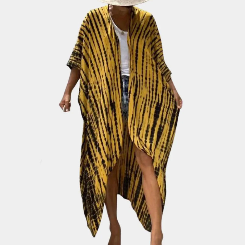 Onze oversized kimono met een helder batikpatroon is gemaakt van eersteklas stof met natuurlijke vezels voor ultiem ademend vermogen en comfort. De kimono wordt geleverd met een riem en biedt verschillende stylingopties. Combineer hem met je favoriete jeans en een topje voor een casual flair, drapeer hem als luxe kamerjas of draag hem als elegante badjas voor op het strand.