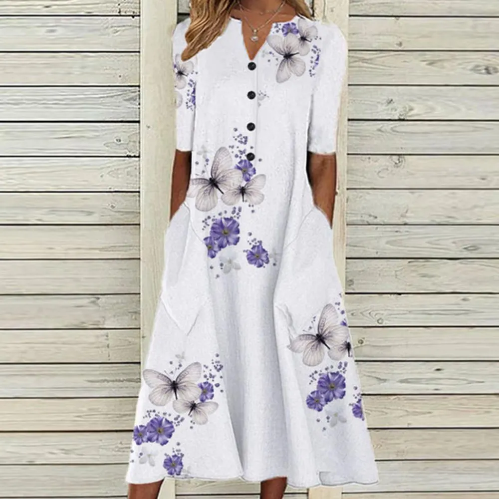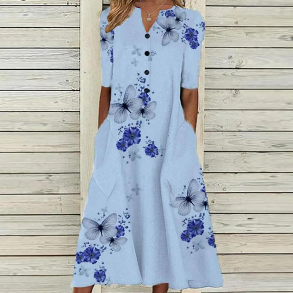 Dit prachtige zomerjurkje heeft een praktische zak en mooie knopen. Het heeft een elegante, losse pasvorm die moeiteloos om het lichaam valt.