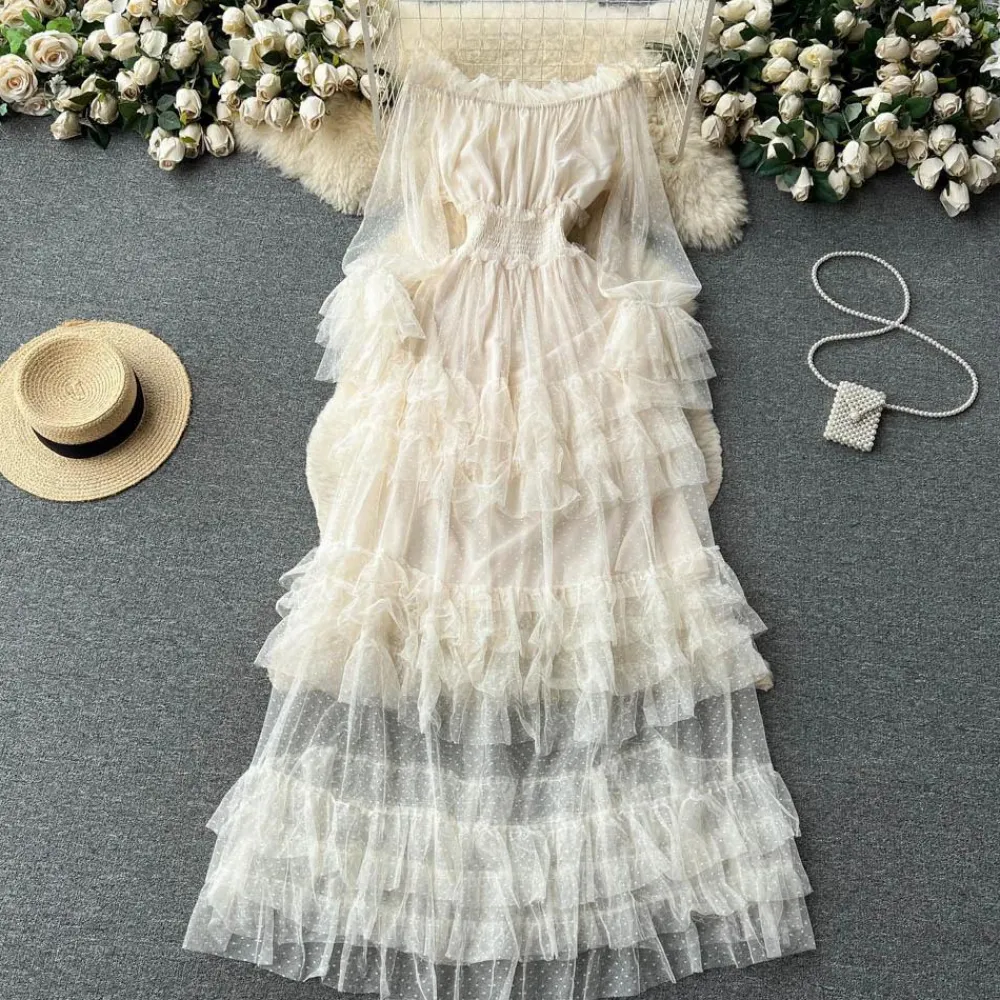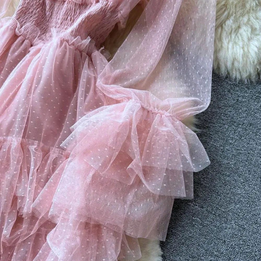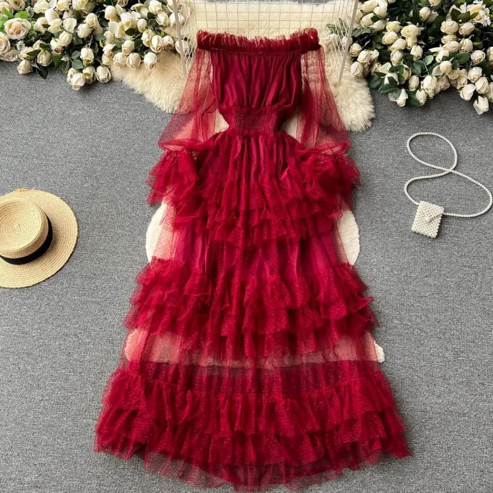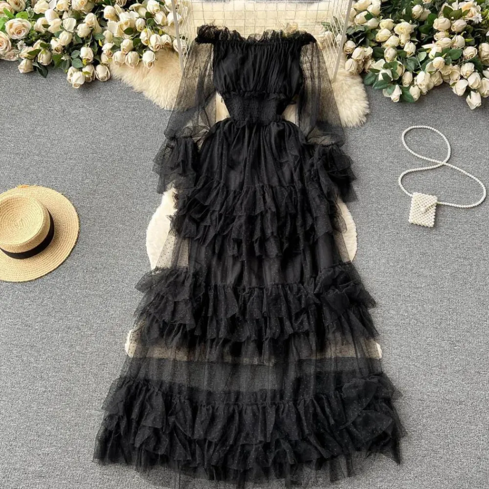 Omarm de sfeer met gratie in onze elegante laagjesjurk, voorzien van doorzichtige patchwork-details en een slank silhouet. Maak elk moment onvergetelijk met dit tijdloze stuk.