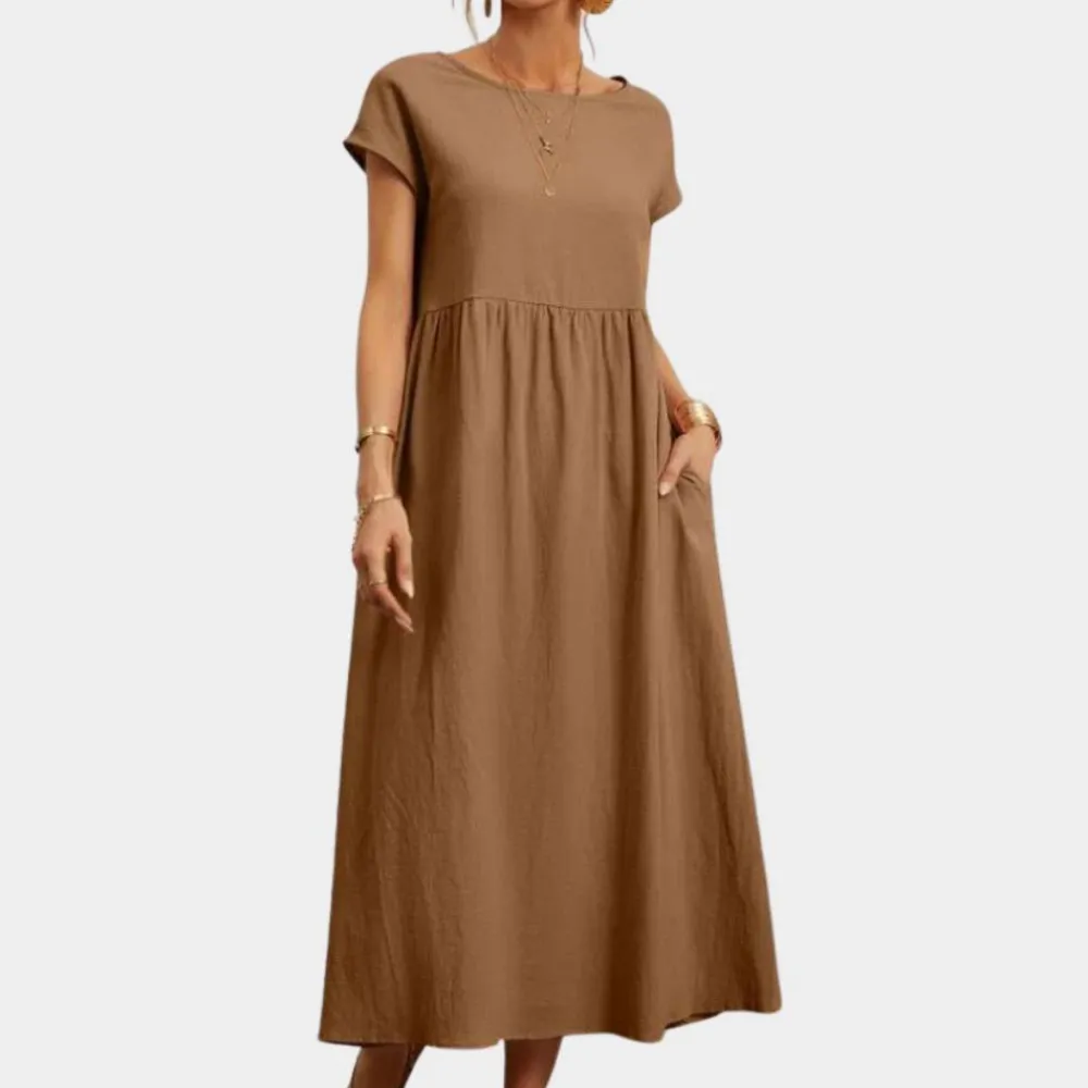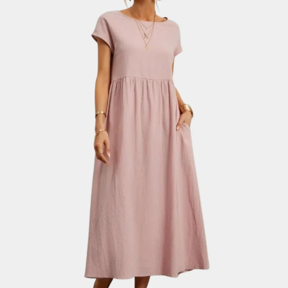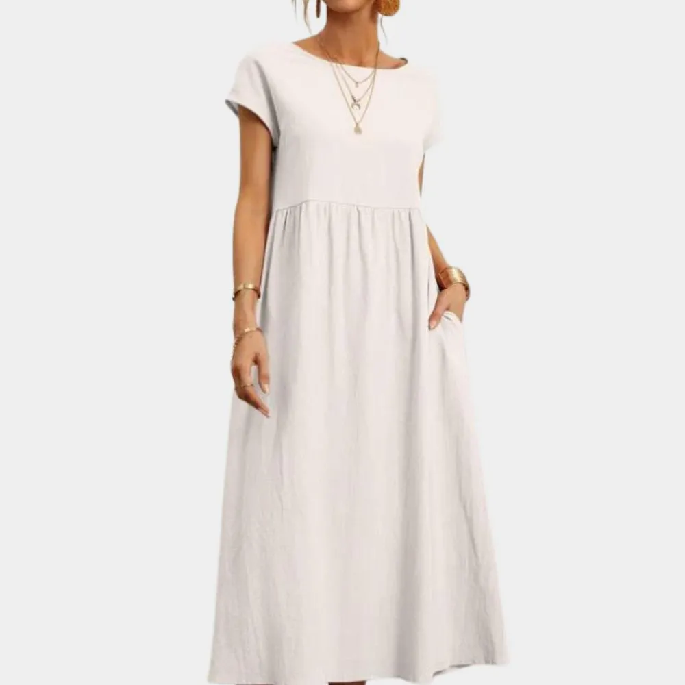 Onze 100% katoenen linnen jurk is volumineus en heeft een losse pasvorm. Flatterend voor alle vormen en maten met schattige elastische zakken.