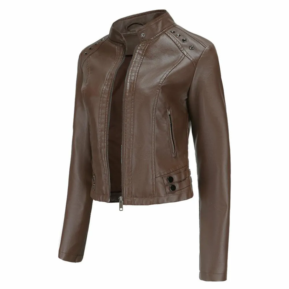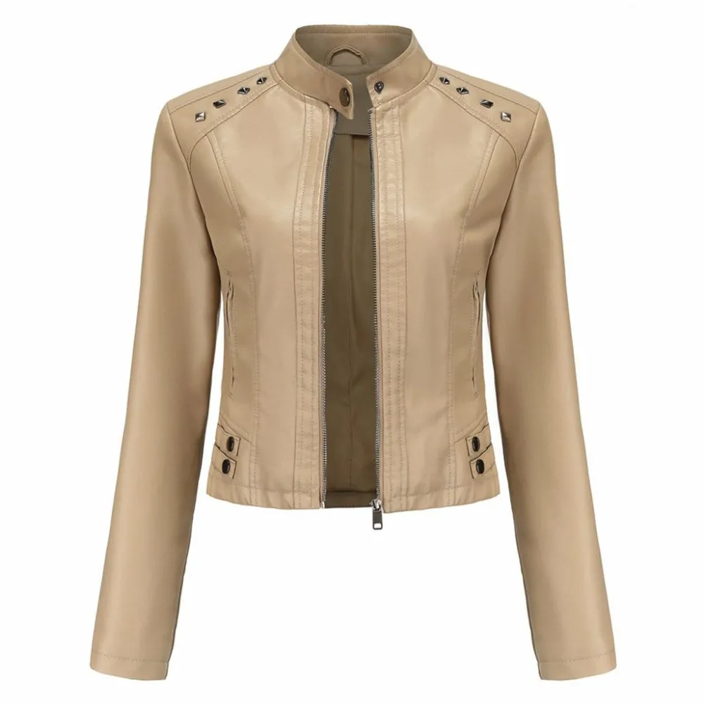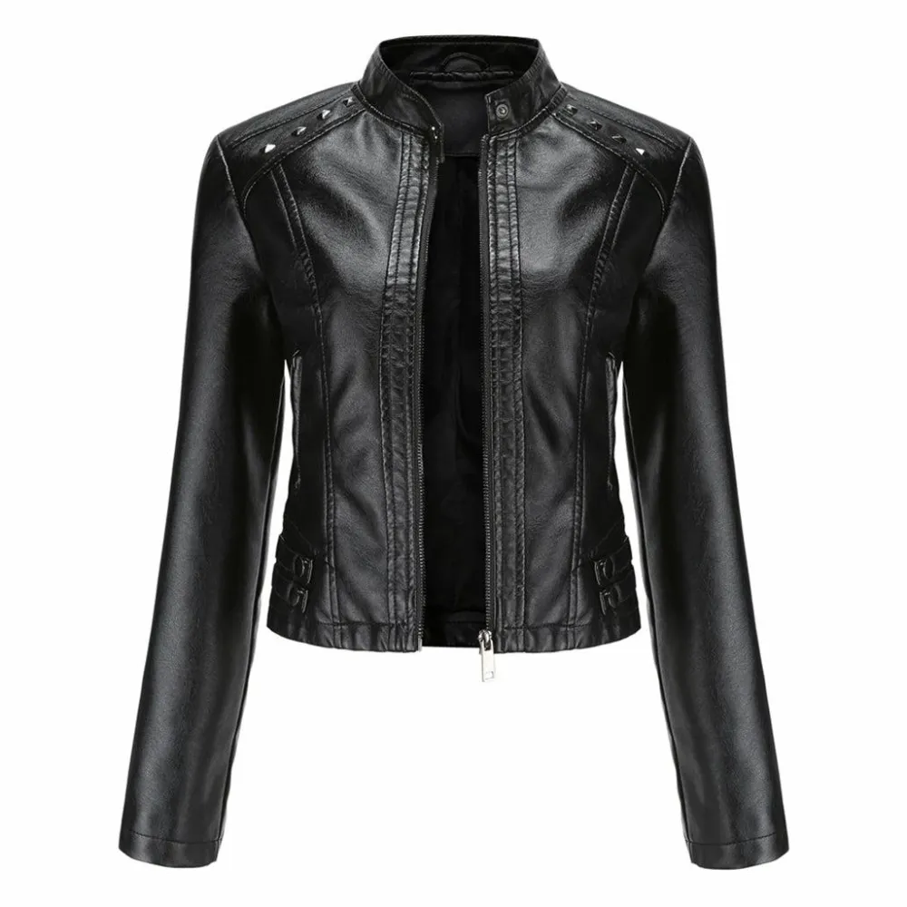 De jas heeft een symmetrische rits en een chique opstaande kraag met een knoop, en decoratieve klinknagels op de schouder, die er vooral stijlvol uitzien als ze open worden gedragen. Het heeft twee zijhandzakken met rits die voldoende ruimte bieden voor uw handen, sleutels en andere kleine voorwerpen.