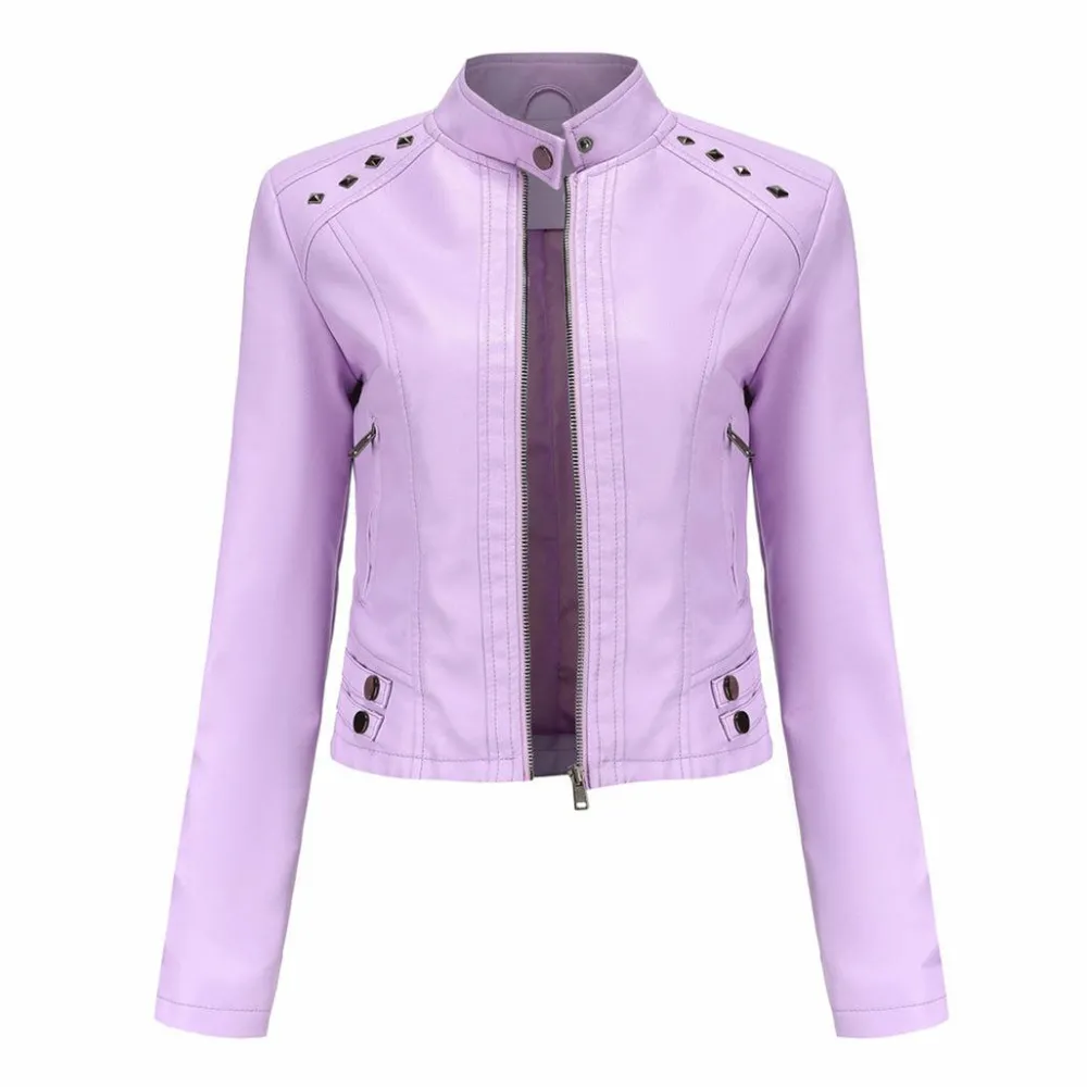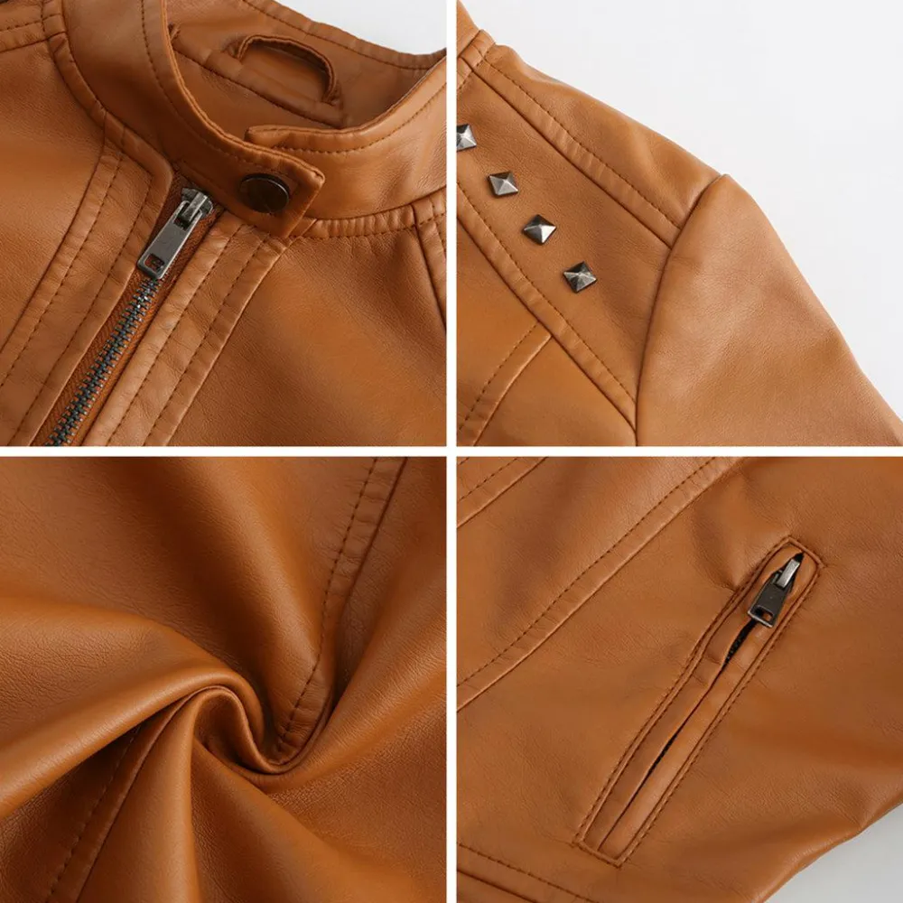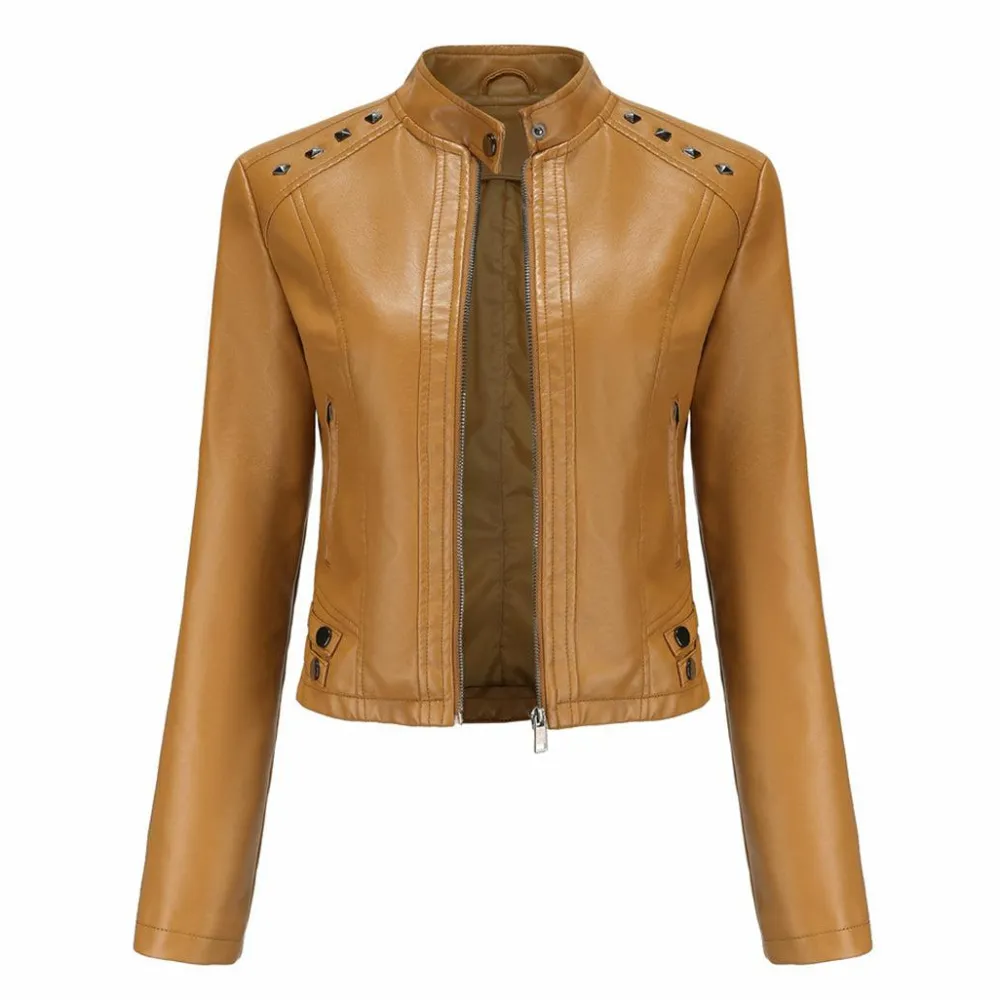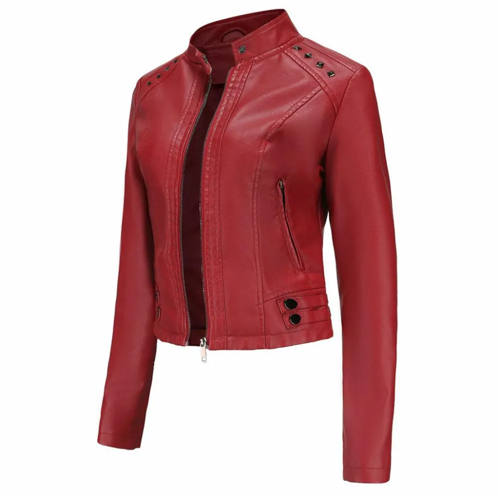De jas heeft een symmetrische rits en een chique opstaande kraag met een knoop, en decoratieve klinknagels op de schouder, die er vooral stijlvol uitzien als ze open worden gedragen. Het heeft twee zijhandzakken met rits die voldoende ruimte bieden voor uw handen, sleutels en andere kleine voorwerpen.