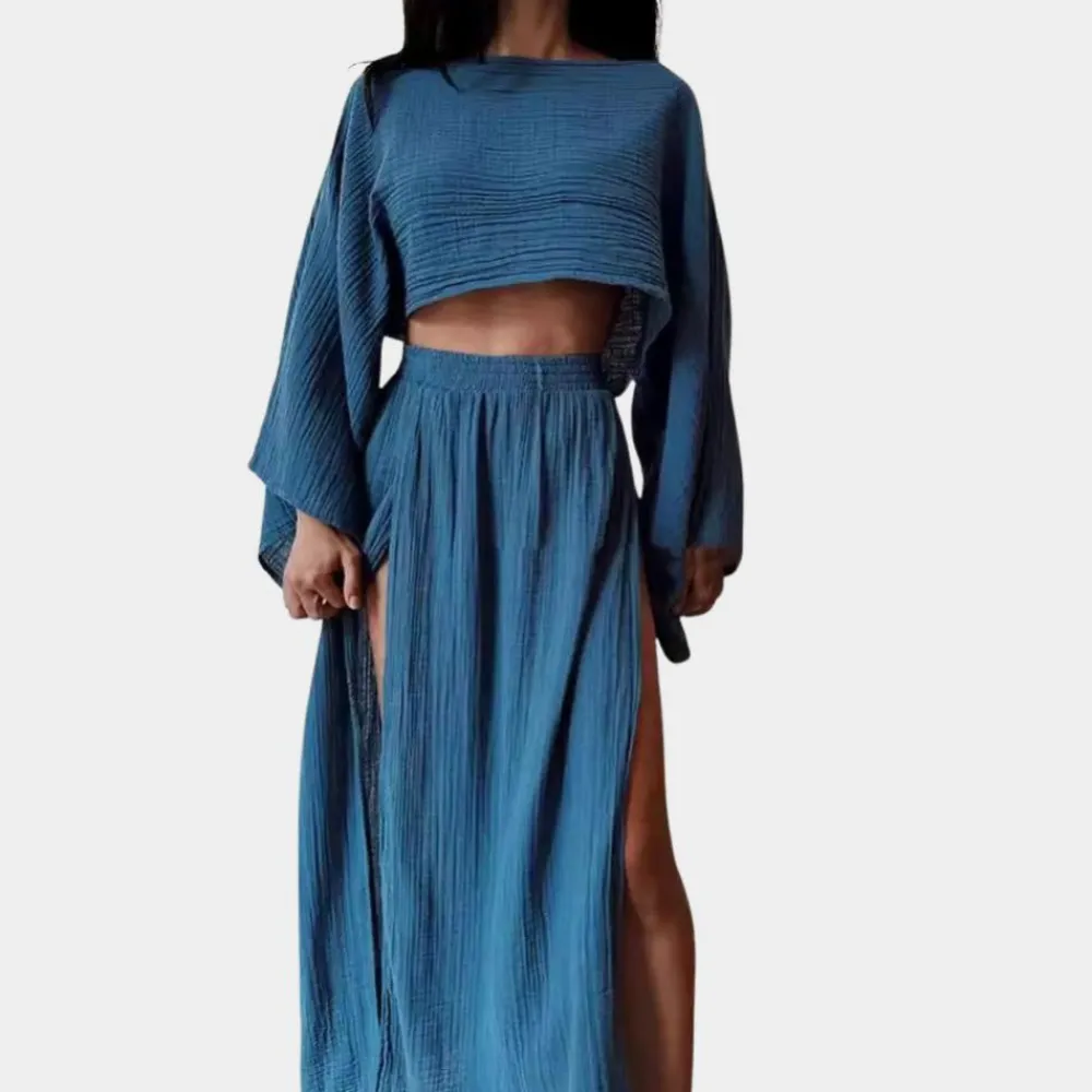 Laat je verleiden door de allure van Alodia Tweedelige casual damesset met hoge split, ontworpen om te betoveren met haar chique verfijning en speelse charme. Met een hoge split voor een vleugje allure en gecoördineerde stukken voor moeiteloze styling, zal Alodia Tweedelige casual damesset met hoge split zeker hoofden doen omdraaien bij elke stap terwijl je geniet van het comfort van casual elegantie.