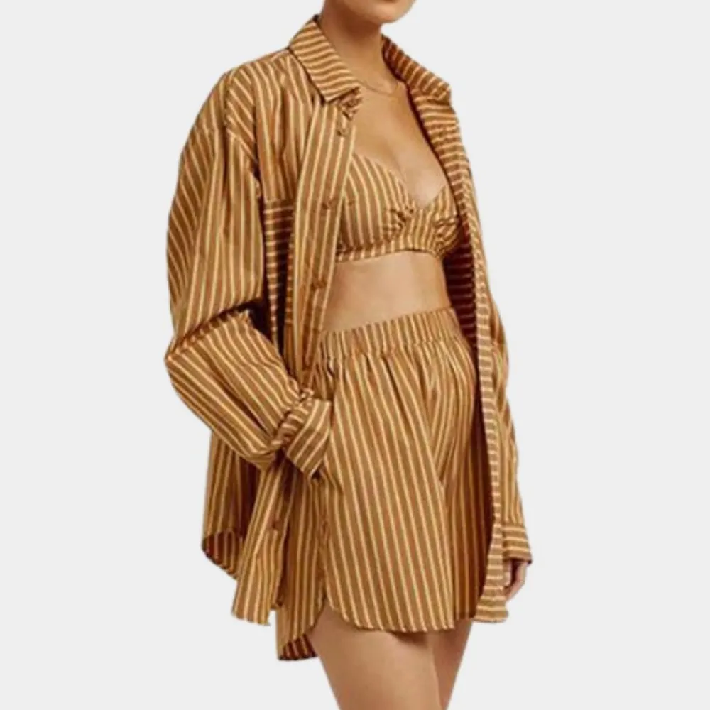 Ervaar de tijdloze verfijning van Casual driedelige damesset, een elegante driedelige set bestaande uit een stijlvolle short, een luchtige top en een luchtige blouse. Dit ensemble is gemaakt van hoogwaardig polyester en biedt zowel comfort als stijl.