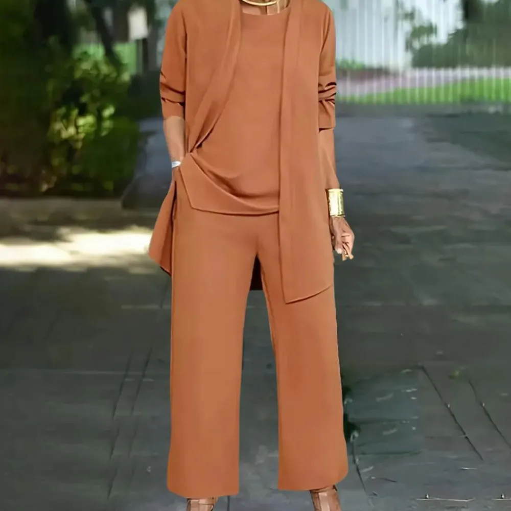 - Comfort en stijl: De set bestaat uit een elegante top, een bijpassende broek en een vest, die je de hele dag door comfortabel en modieus houden.
