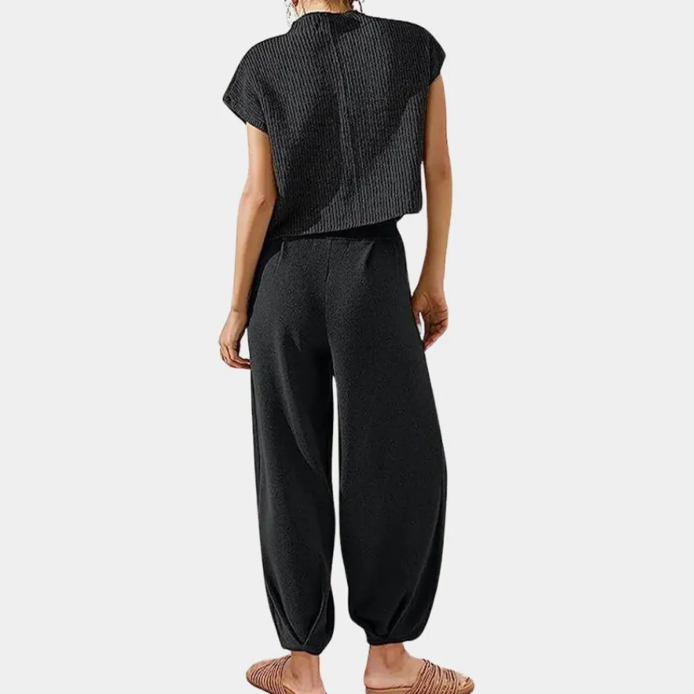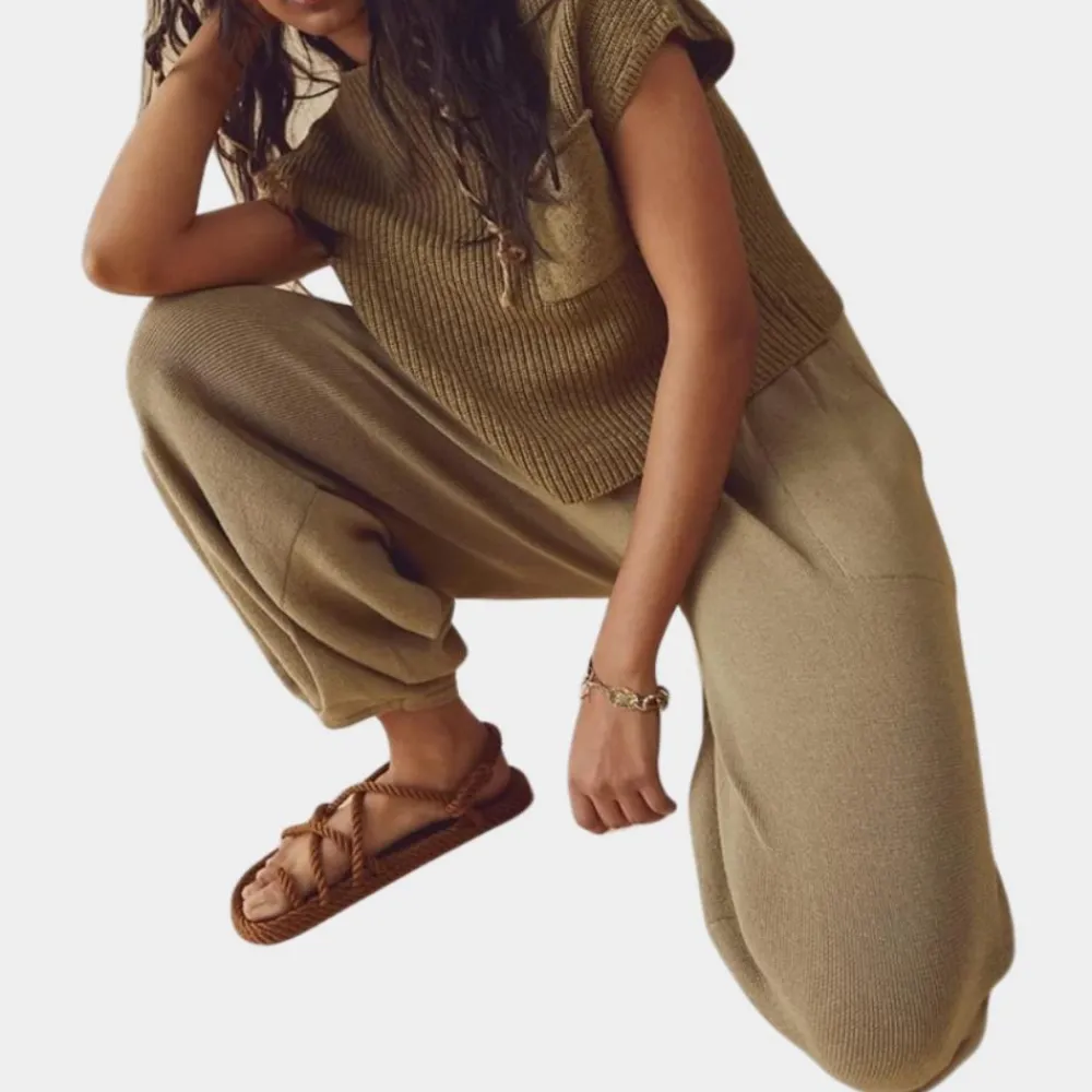 - Ontwerp: De Emma Damesset tops en broeken bestaat uit een gebreid T-shirt met korte mouwen en een klassieke ronde hals en een loungebroek met hoge taille voor een comfortabele en chique look.