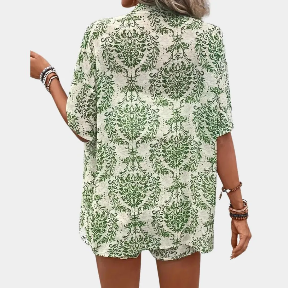 De Guiliana groene zomerset voor dames met blouse en korte broek met print is precies wat je nodig hebt. Deze 2-delige zomer set voor dames combineert stijl en comfort, ideaal voor elke zomerse dag.
