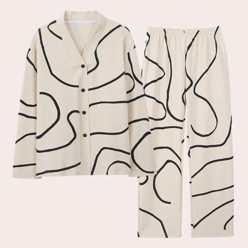 Het bestaat uit een zacht, vrijvallend shirt en bijpassende broek, vervaardigd uit hoogwaardige materialen die prettig aanvoelen op de huid.