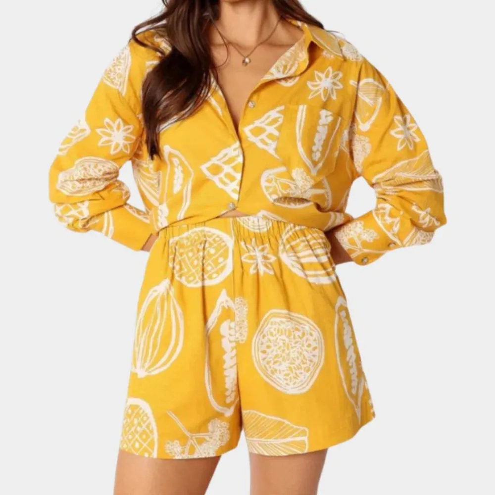 De Natasa Modieuze en bedrukte damesset is de perfecte keuze voor een frisse en stijlvolle look. Deze set maakt indruk met zijn levendige printpatronen die een vrolijke toets geven aan elke outfit. Hij is gemaakt van lichtgewicht en ademend materiaal en biedt maximaal comfort en bewegingsvrijheid. Ideaal voor stranddagen, ontspannen weekends of zomerse uitstapjes.