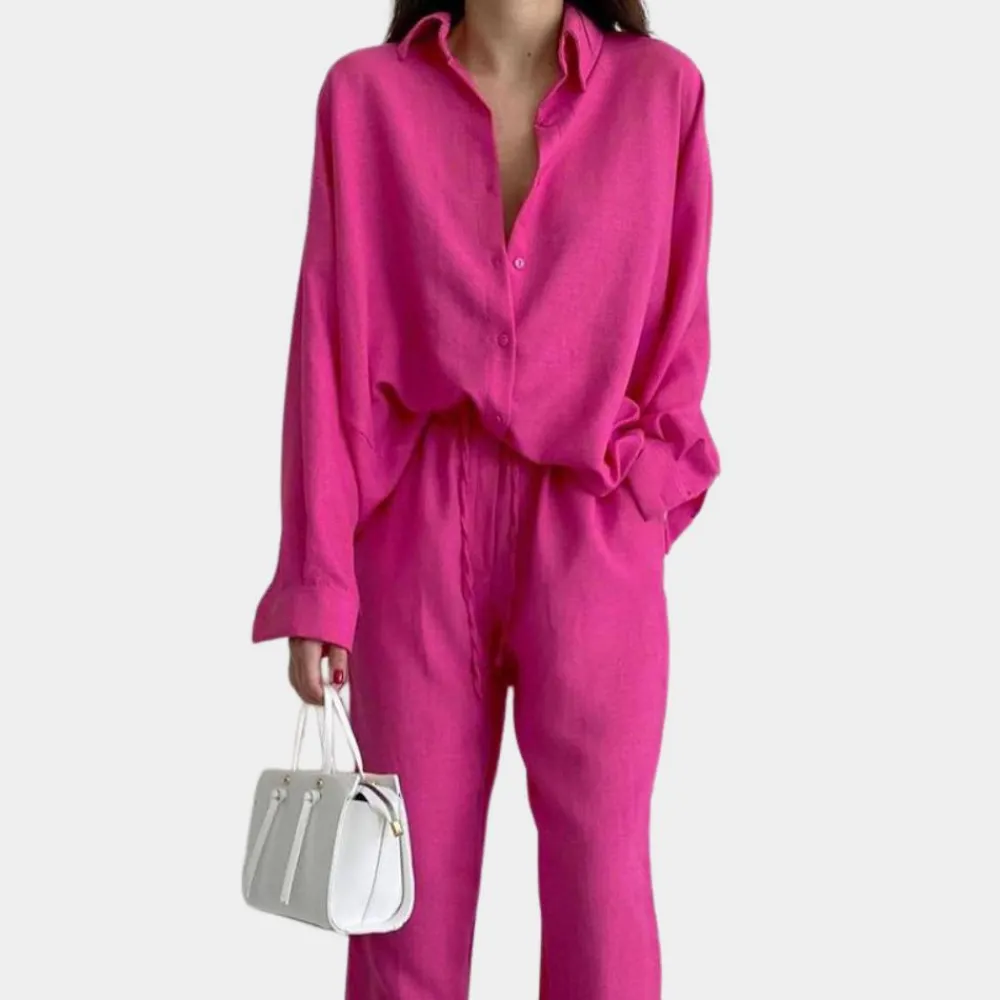 De Nera comfortabele tweedelige dames set met lange blazer en broek is de perfecte keuze. Beschikbaar in de kleuren beige, oranje en roze, combineert deze stijl en comfort voor elke gelegenheid.