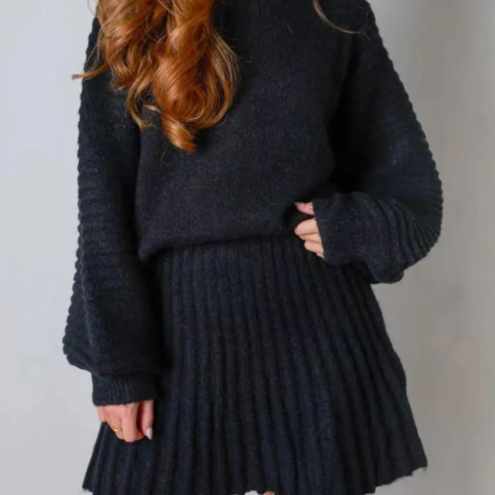 Ontdek verfijnde schoonheid en comfort met Norra. Deze elegante set bestaat uit een suède trui en een bijpassende geplooide rok in dezelfde kleur. De trui biedt warmte en luxe, terwijl de rok tijdloze elegantie toevoegt. Norra is de ideale keuze voor vrouwen die op zoek zijn naar moeiteloze stijl en comfort.