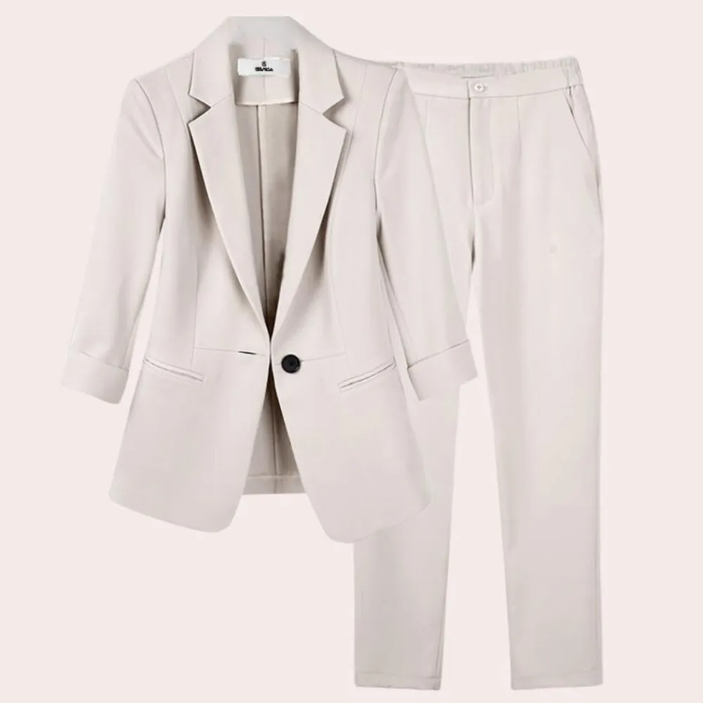 Deze set, met een perfect op elkaar afgestemde blazer en broek, biedt de mogelijkheid om zowel professionele als casual looks te creëren.