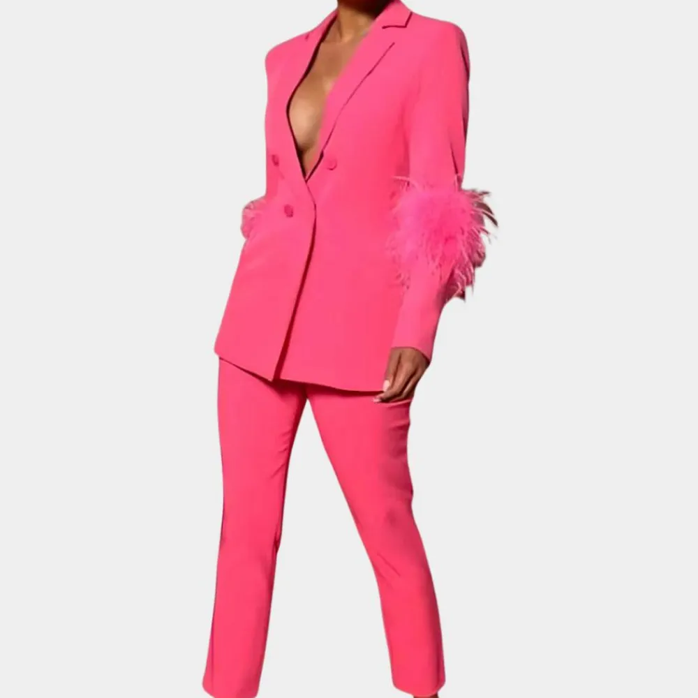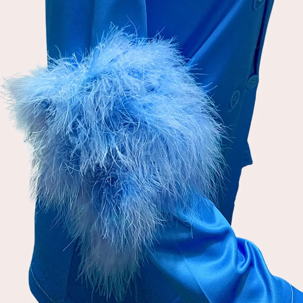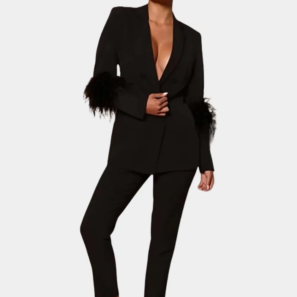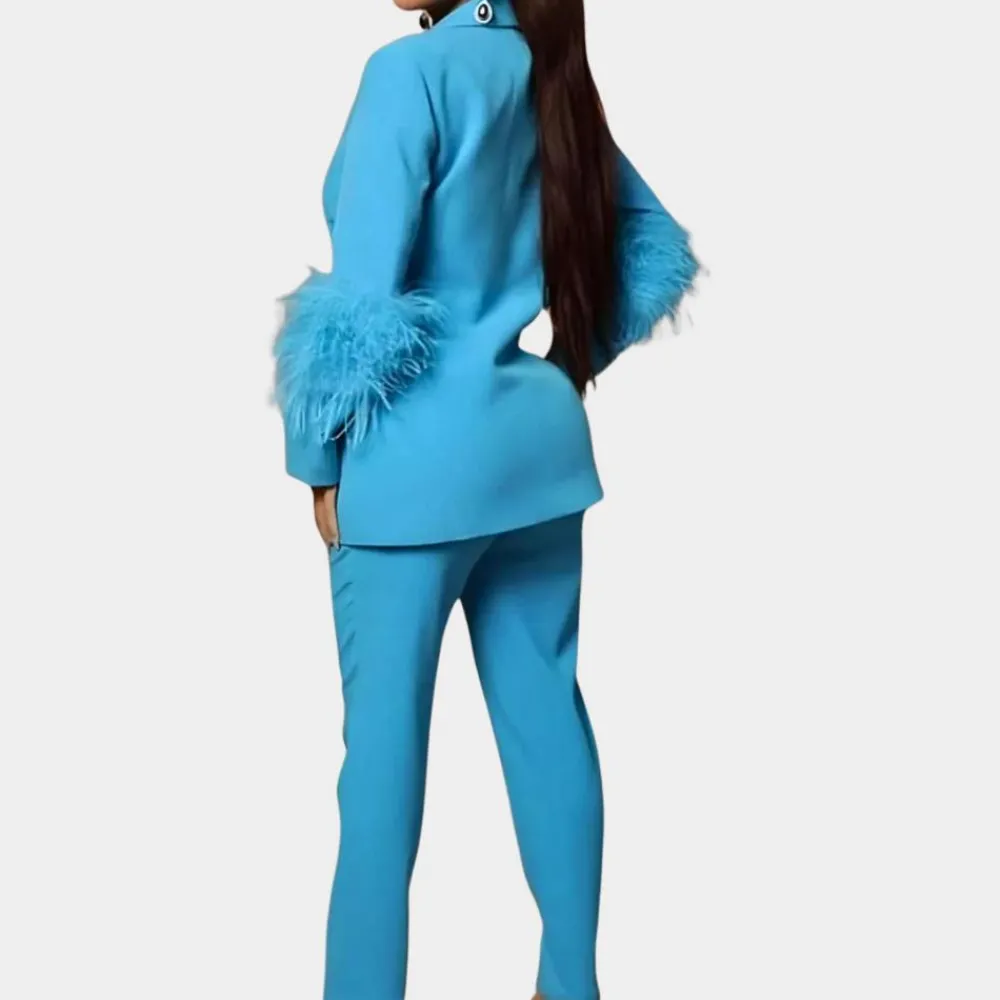 Ontdek de Valery Chic 2-delige dames outfit die je de ster van elke gelegenheid maakt. De lange blazer met verfijnde veerdetails en de bijpassende broek creëren een adembenemende uitstraling die elegantie en extravagantie moeiteloos combineert. Ideaal voor speciale gelegenheden, avondfeesten of stijlvolle evenementen.