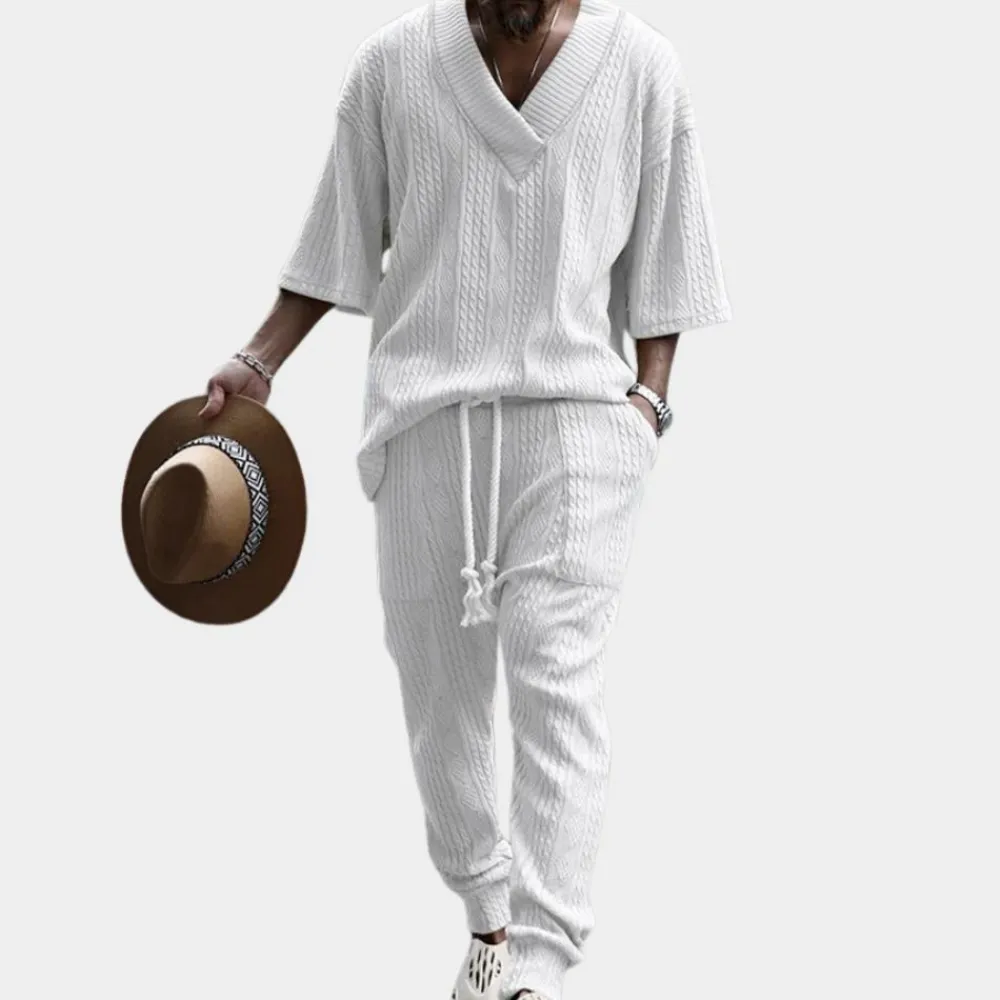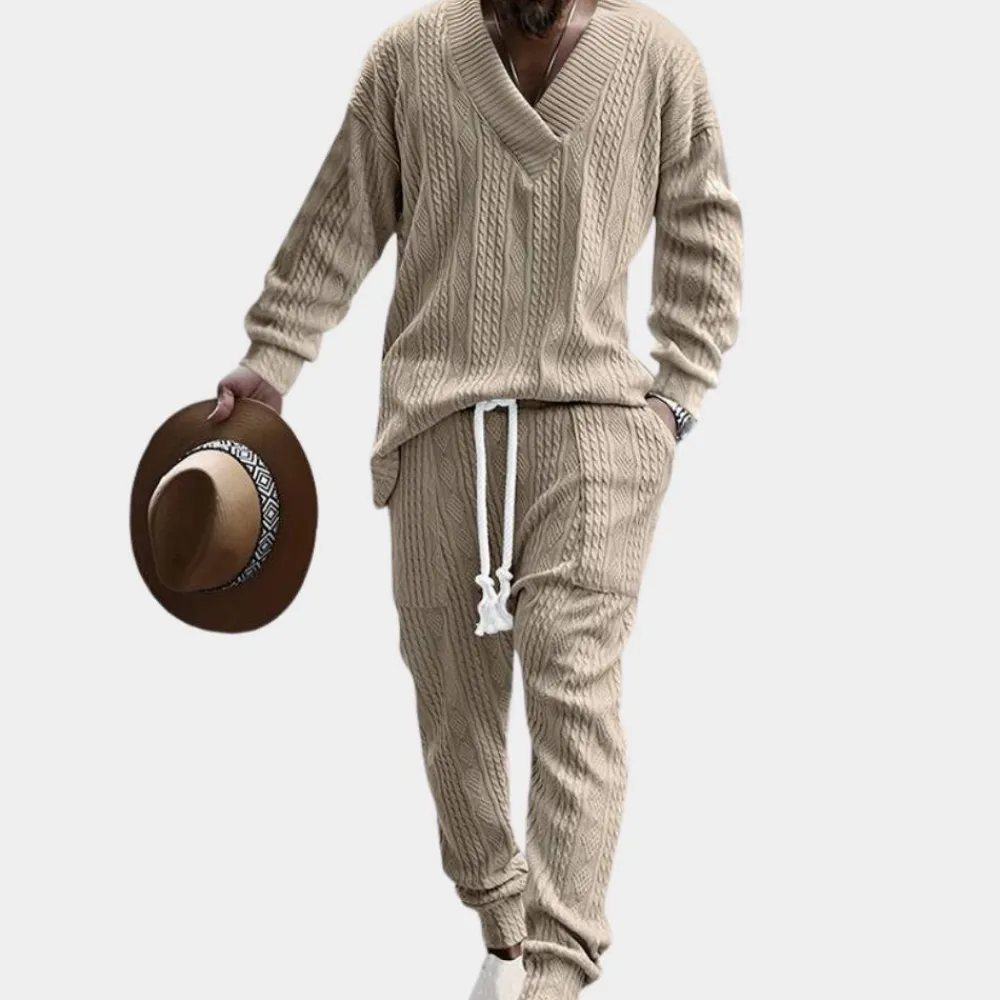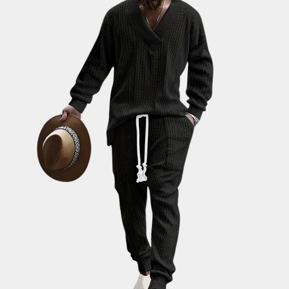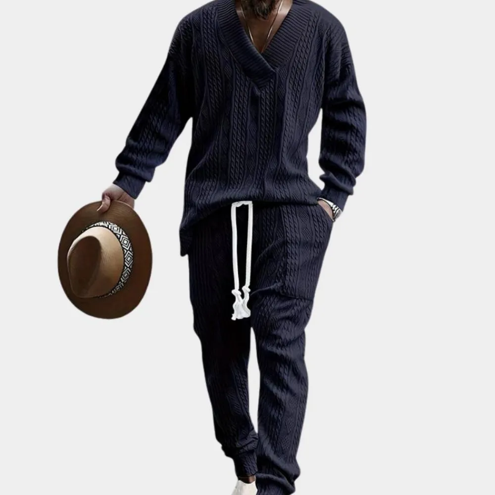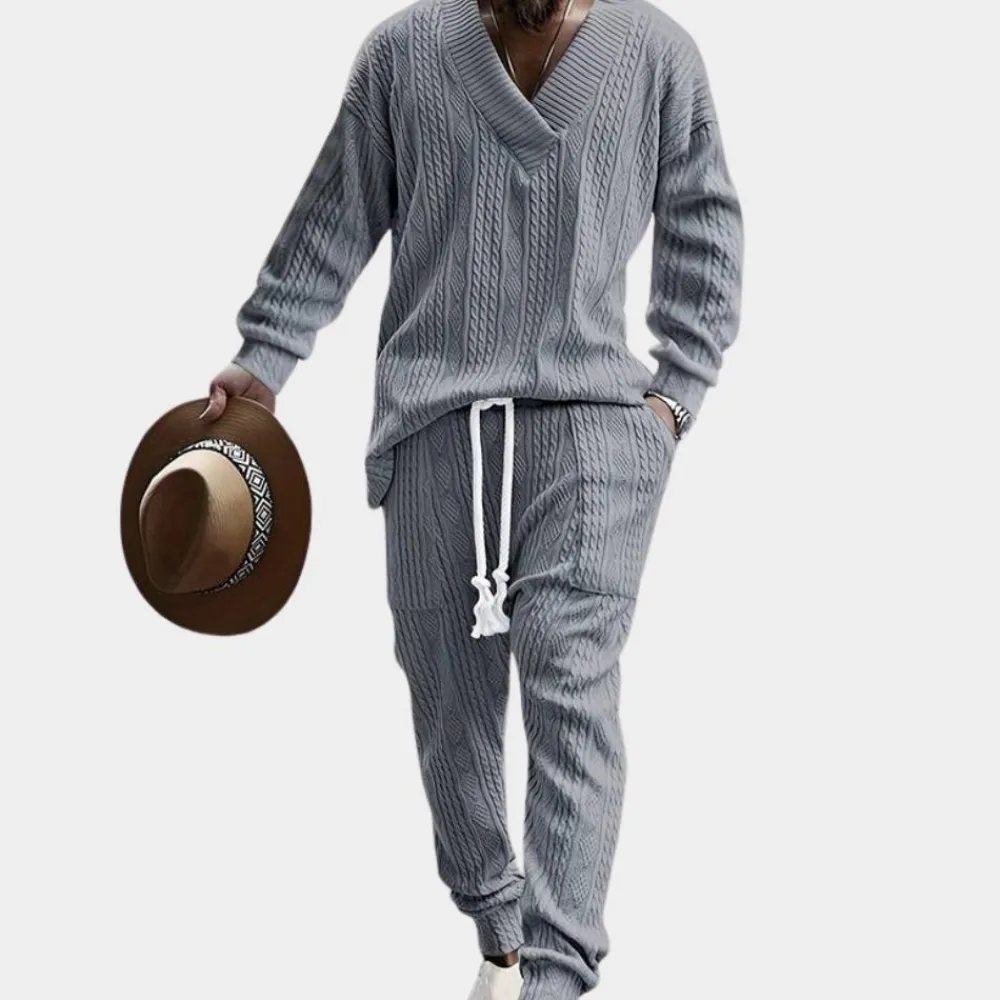 Maak je garderobe compleet met onze tweedelige gebreide herenset. De Duran Gebreide herenset tweedelig combineert naadloos met joggers met trekkoord, compleet met handige zakken. Combineer met sneakers voor een trendy look.