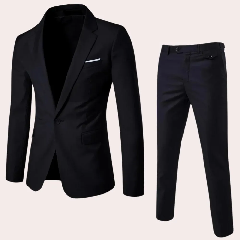 Ons heren pak met blazer en pantalon, verkrijgbaar in de kleuren rood, donkerblauw, lichtblauw, khaki, grijs en zwart, biedt de perfecte combinatie van elegantie en comfort. Dit is ideaal voor elke modieuze man die indruk wil maken.
