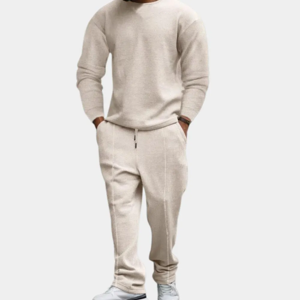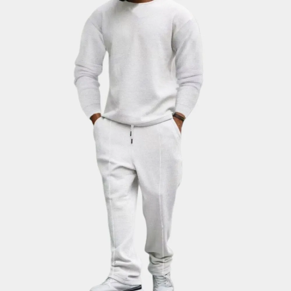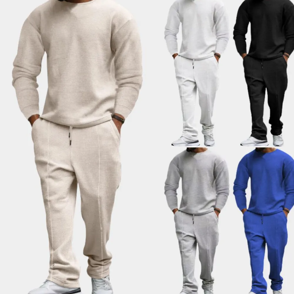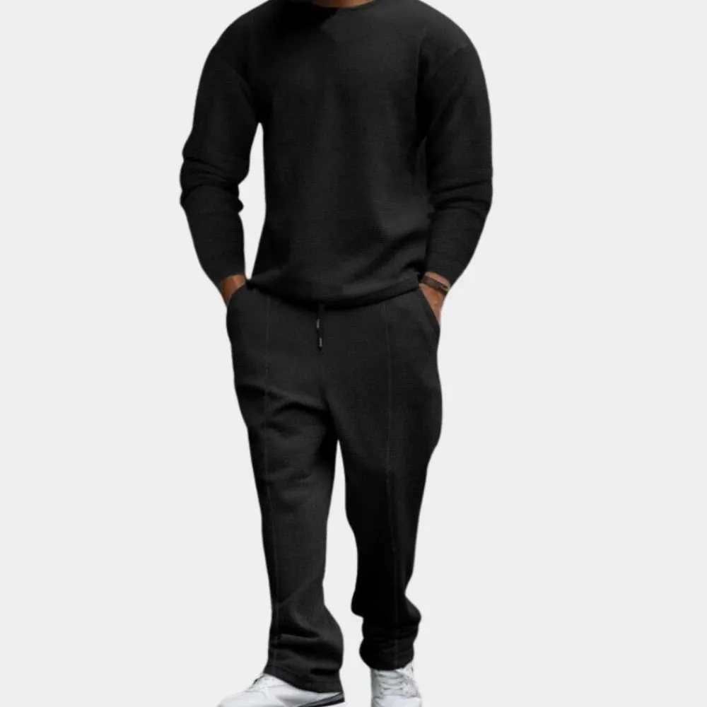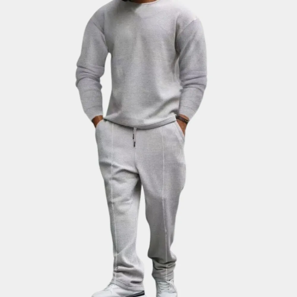 Hier heb je onze Larue Comfortabele heren tweedelige set. Deze 2-delige set is zowel comfortabel als stijlvol voor het uitgaan, maar ook voor thuis op de bank. Deze 2-delige set is gemaakt van een comfortabele stof die geschikt is voor de lente, herfst en winter.