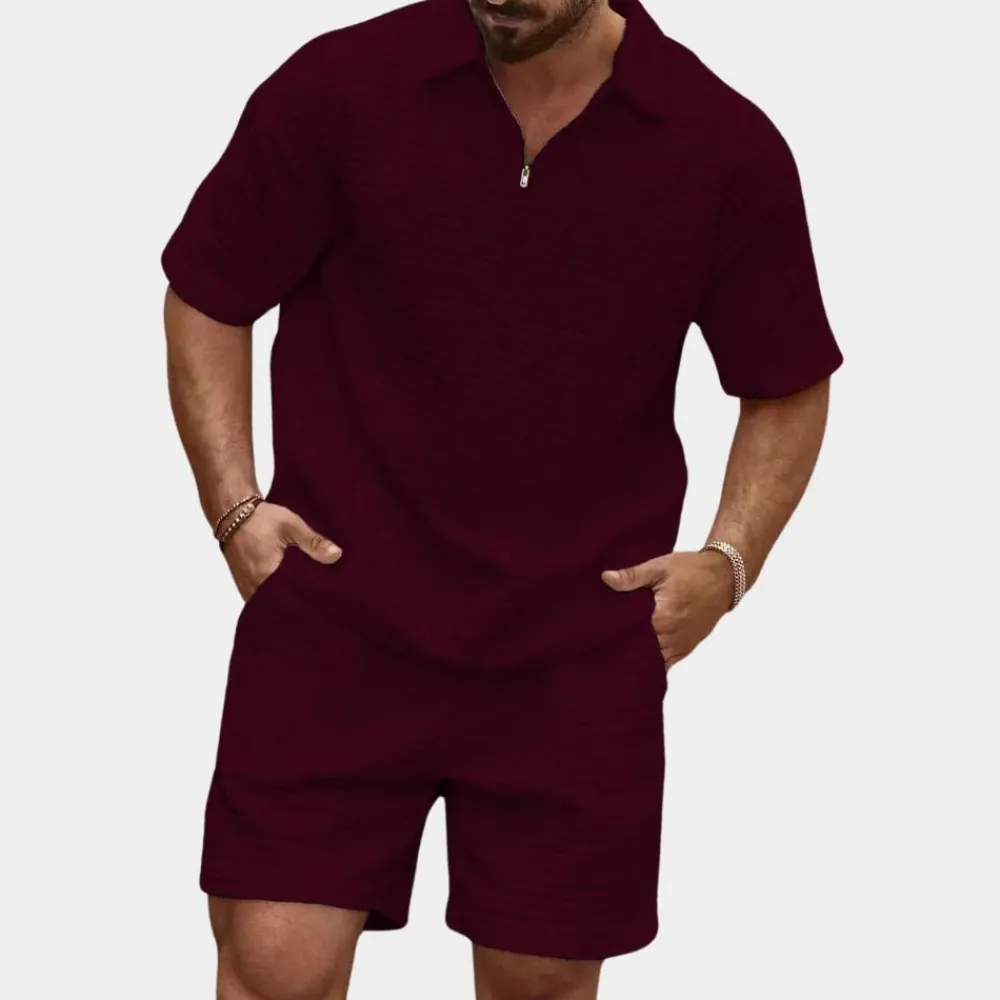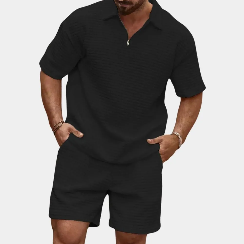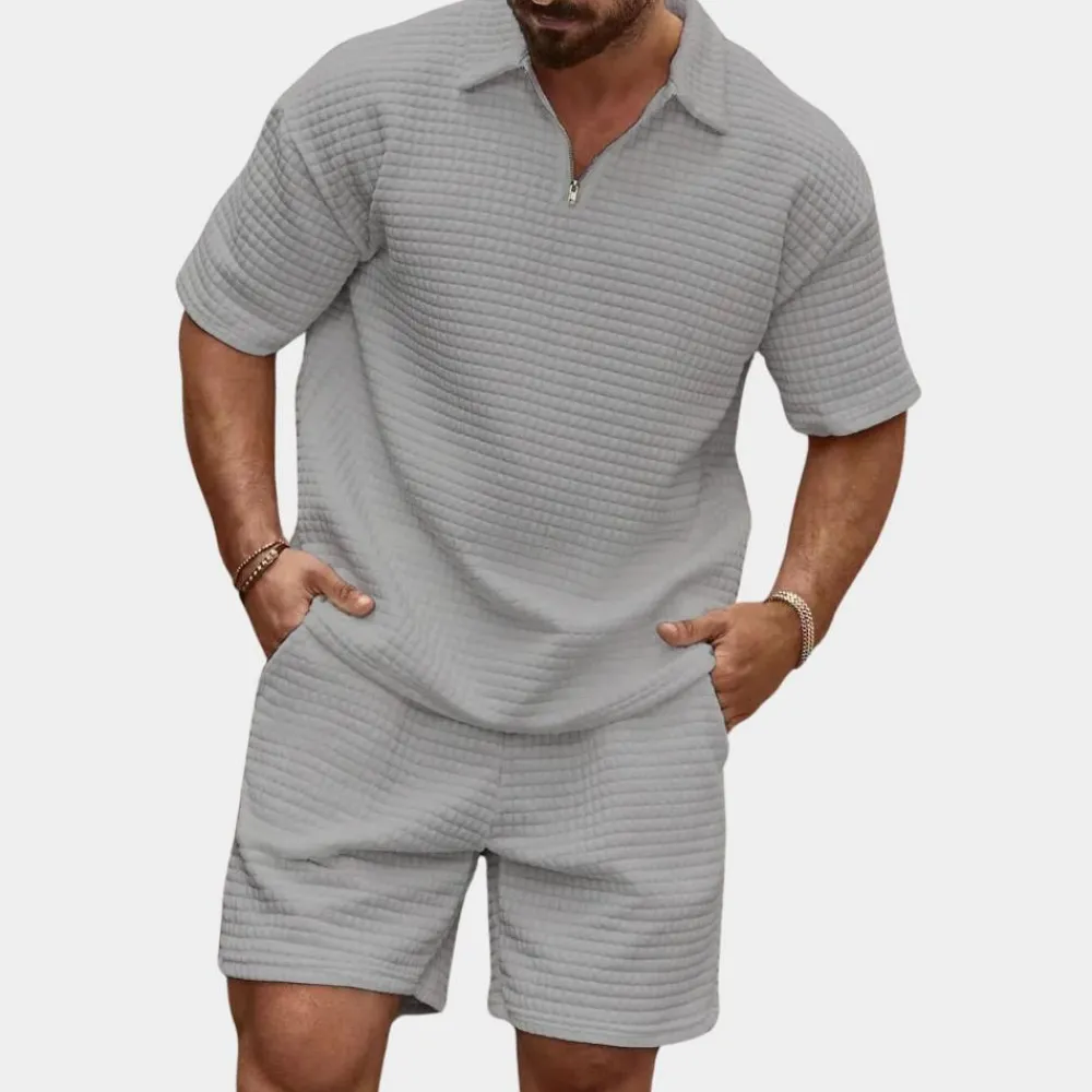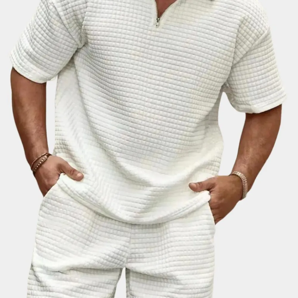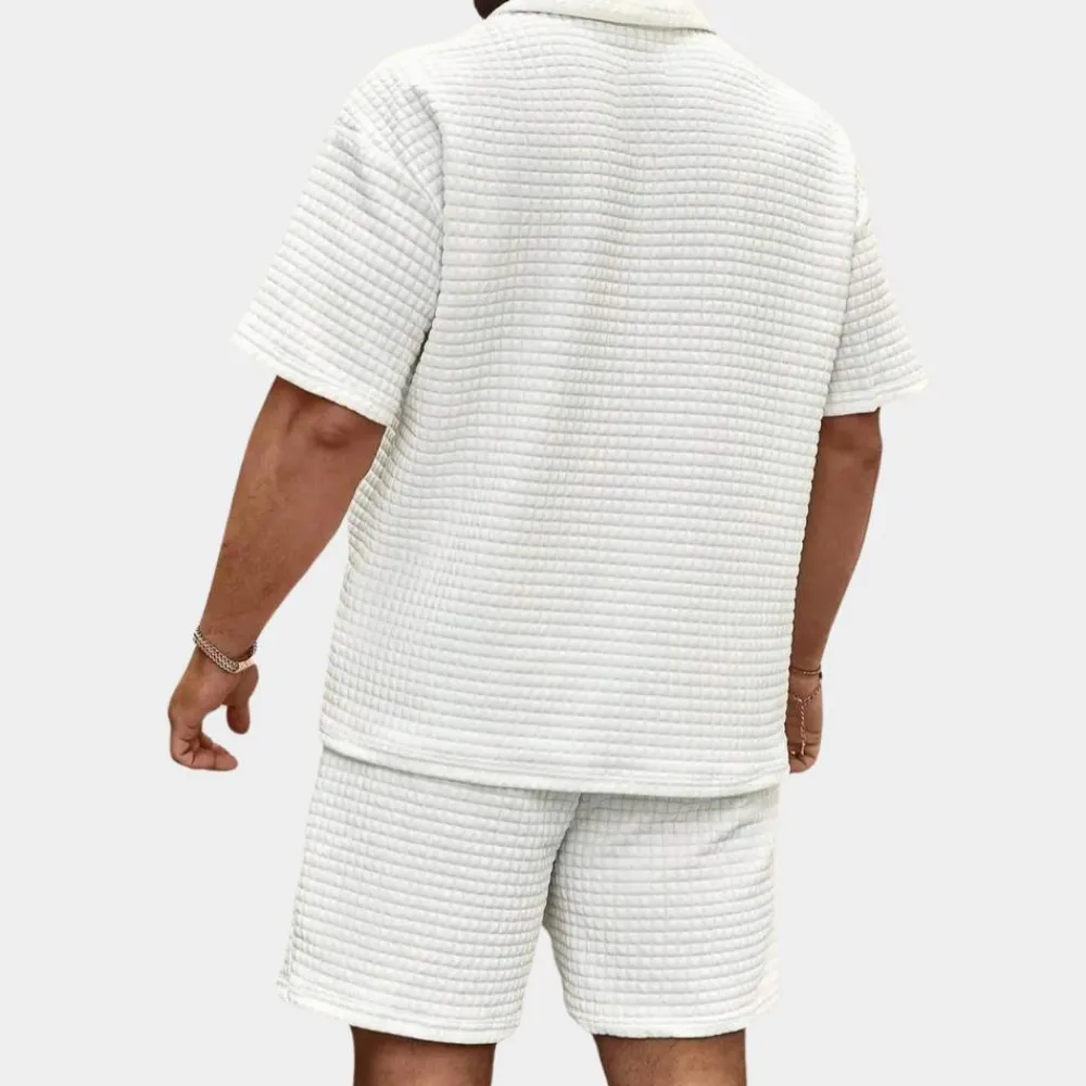 Onze set is een kunstwerk van smaak en functionaliteit, perfect voor de moderne man die op zoek is naar een vleugje verfijning in zijn dagelijks leven. Het geribbelde dessin geeft het overhemd een unieke charme, terwijl de bijpassende short de look compleet maakt en u een onderscheidende uitstraling garandeert.