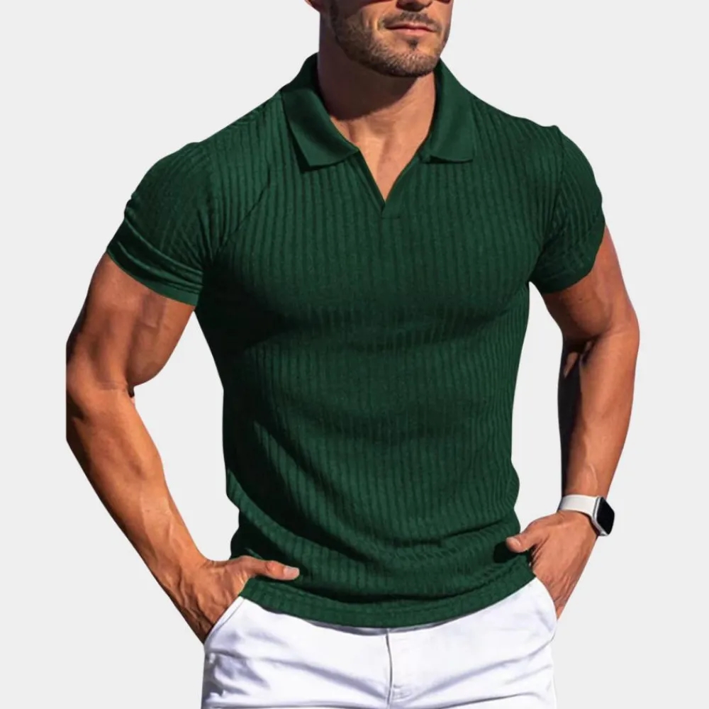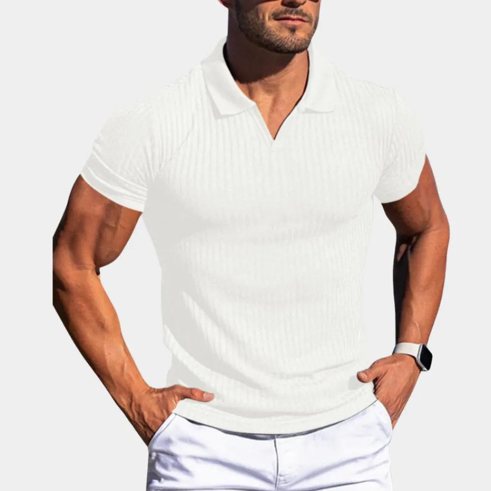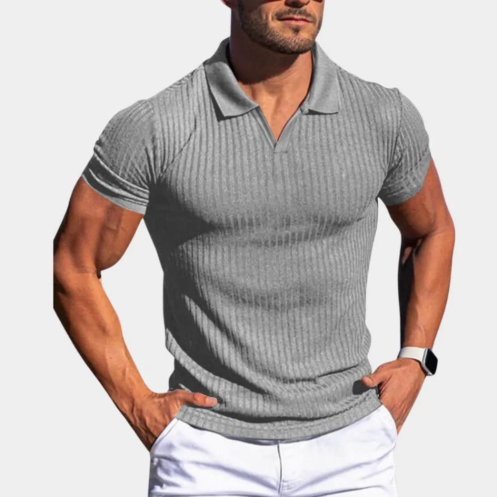 Deze polo biedt onberispelijk comfort en uitstekend vakmanschap. Het is gemaakt van hoogwaardige materialen en heeft een slim fit met fijn ribboordweefsel voor een authentieke look. Het shirt heeft een kleine V-vormige opening bij de kraag, verlaagde schouders en korte mouwen voor een eigentijdse twist. Combineer het met andere casual items voor een complete look.