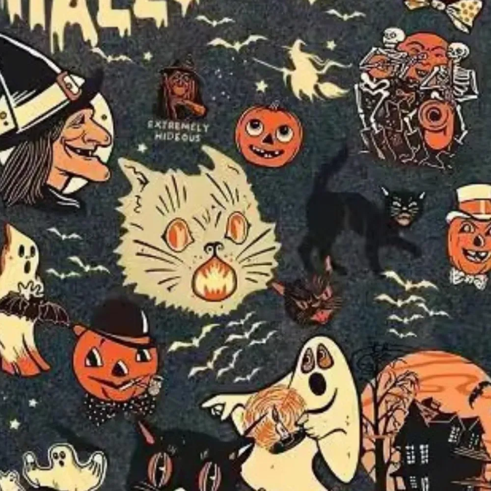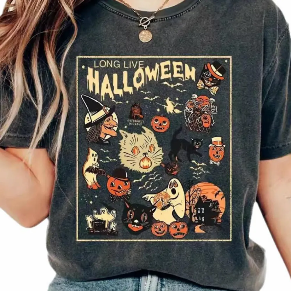 Breng wat Halloween-sfeer in je garderobe met het Jazmina Casual Halloween T-shirt voor dames. Dit shirt heeft een speels, retro-ontwerp met allerlei Halloween-iconen, van ondeugende pompoenen en griezelige geesten tot een charmante zwarte kat. De levendige oranje en crème tinten steken mooi af tegen de donkere grijze stof.