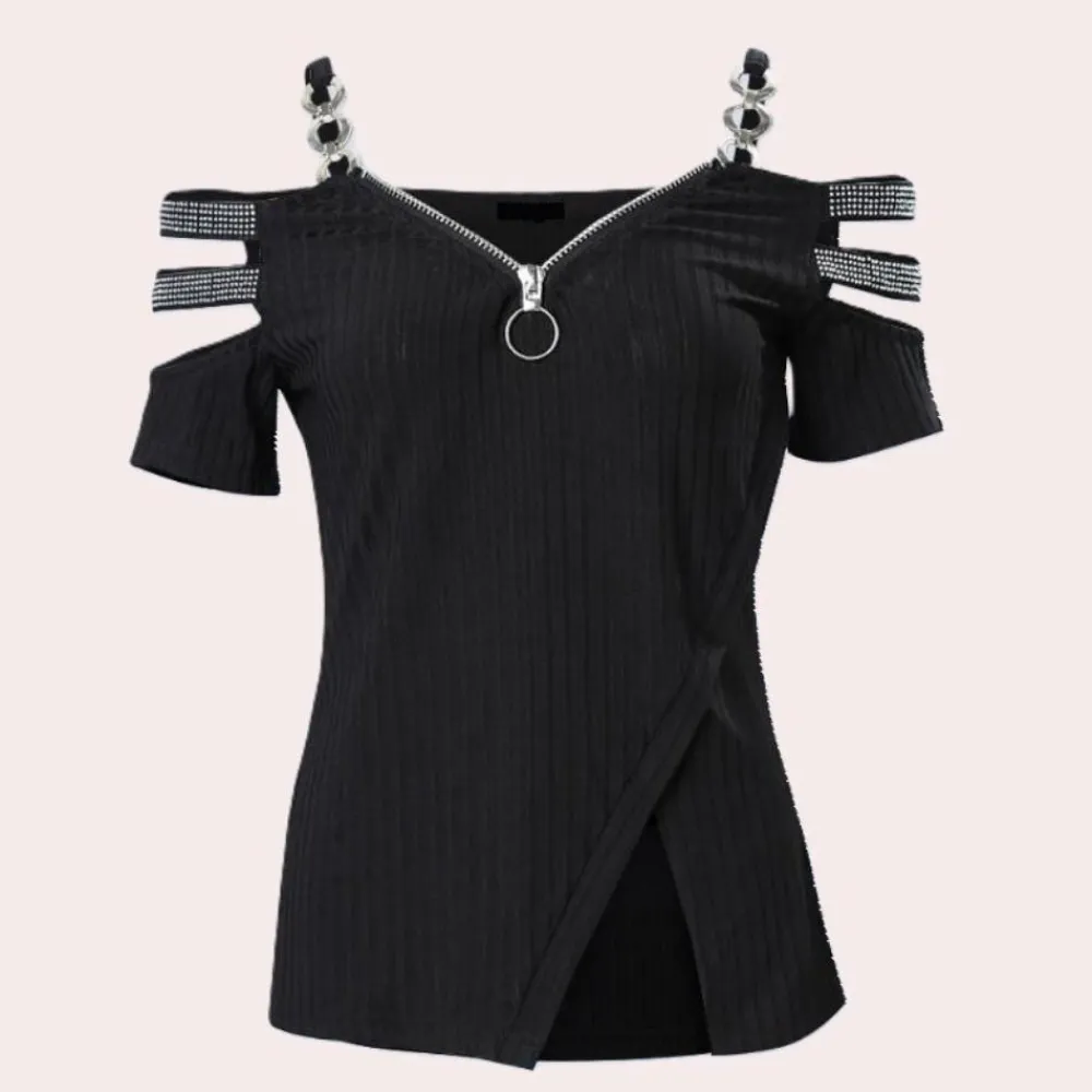De Pavlina Stijlvolle Damestop met Schouderband Accent is perfect voor zowel overdag als ’s avonds. Combineer het met je favoriete jeans en casual schoenen voor een relaxte, maar opvallende look. Of draag het met hakken en nette kleding voor een formele gelegenheid.