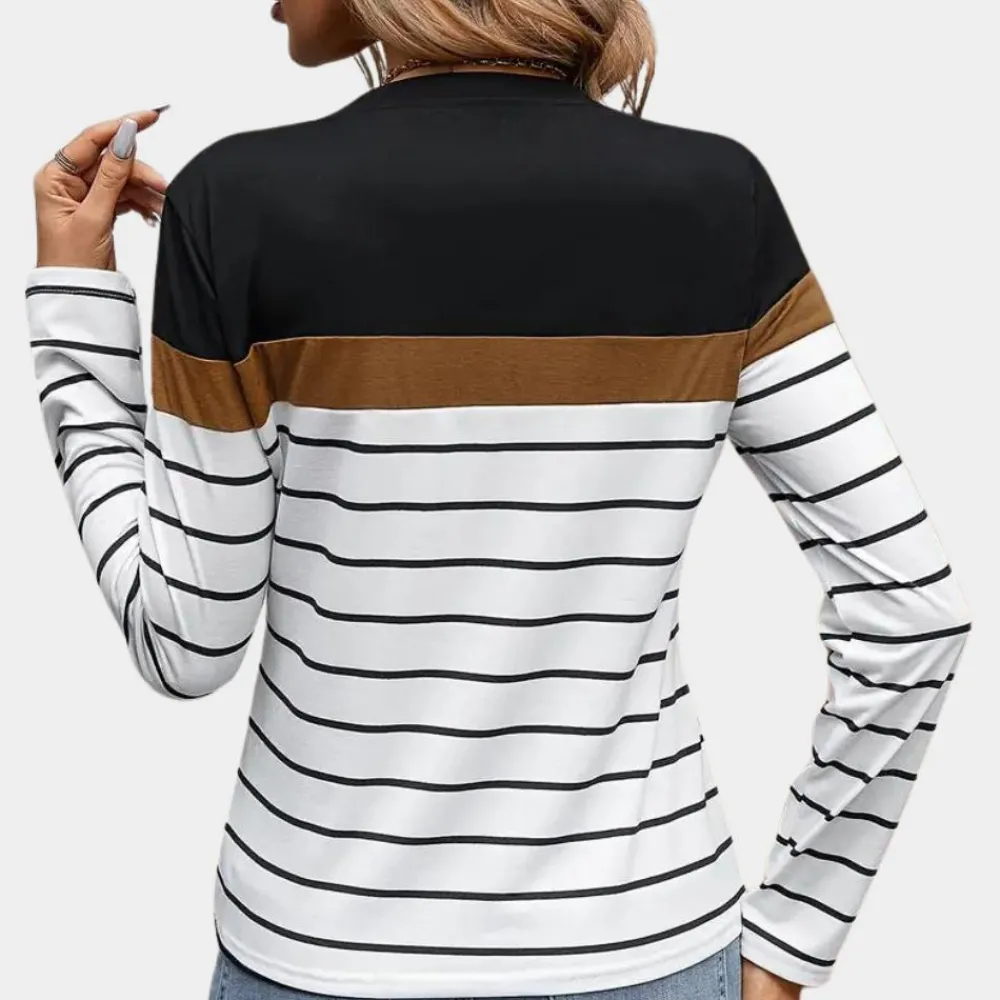 Onze Solveiga Gestreept t-shirt voor dames heeft een mooie vorm die je rondingen benadrukt en je een vrouwelijke uitstraling geeft.