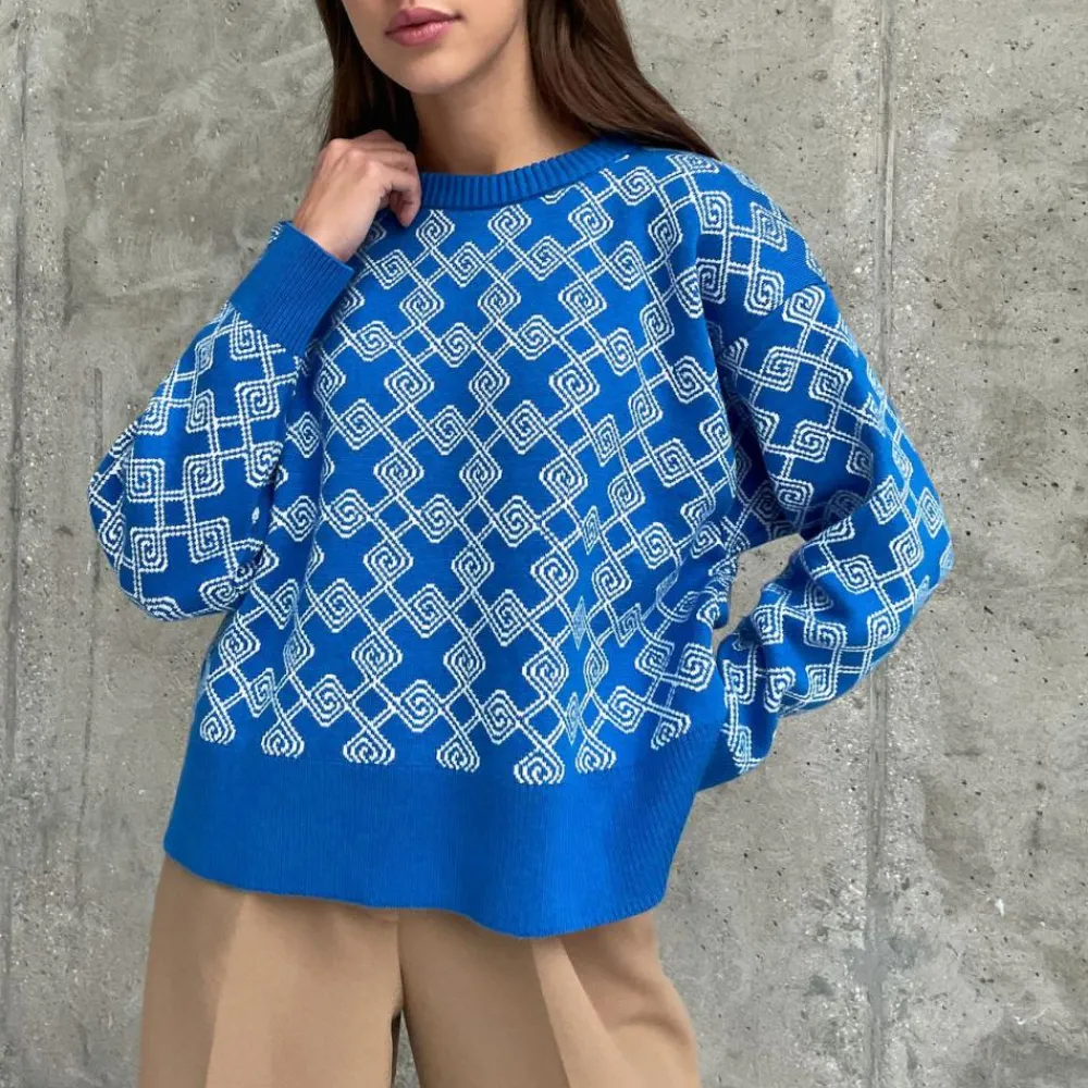 De Ameyalli Comfortabele gebreide dames trui is een levendige en stijlvolle gebreide trui die opvallende patronen en gedurfde kleuren samenbrengt in een uniek ontwerp.