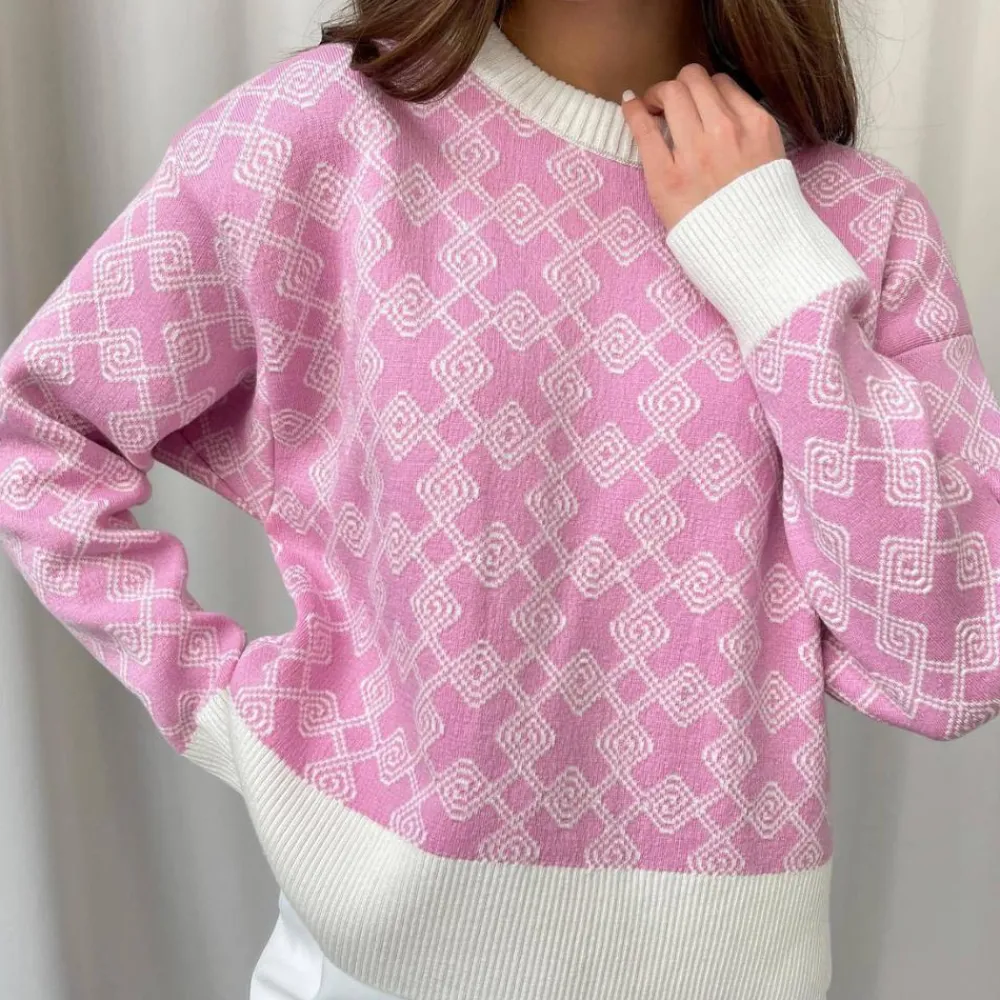 Met een sterke basiskleur en een contrasterend wit geometrisch patroon, biedt deze trui een frisse, moderne draai aan klassiek breiwerk. Gemaakt van zacht, hoogwaardig garen, is de Ameyalli Comfortabele gebreide dames trui perfect voor wie op zoek is naar comfort en stijl tijdens de koudere dagen.
