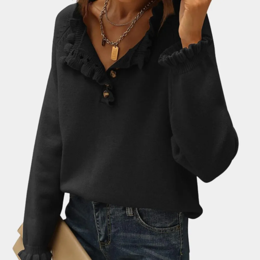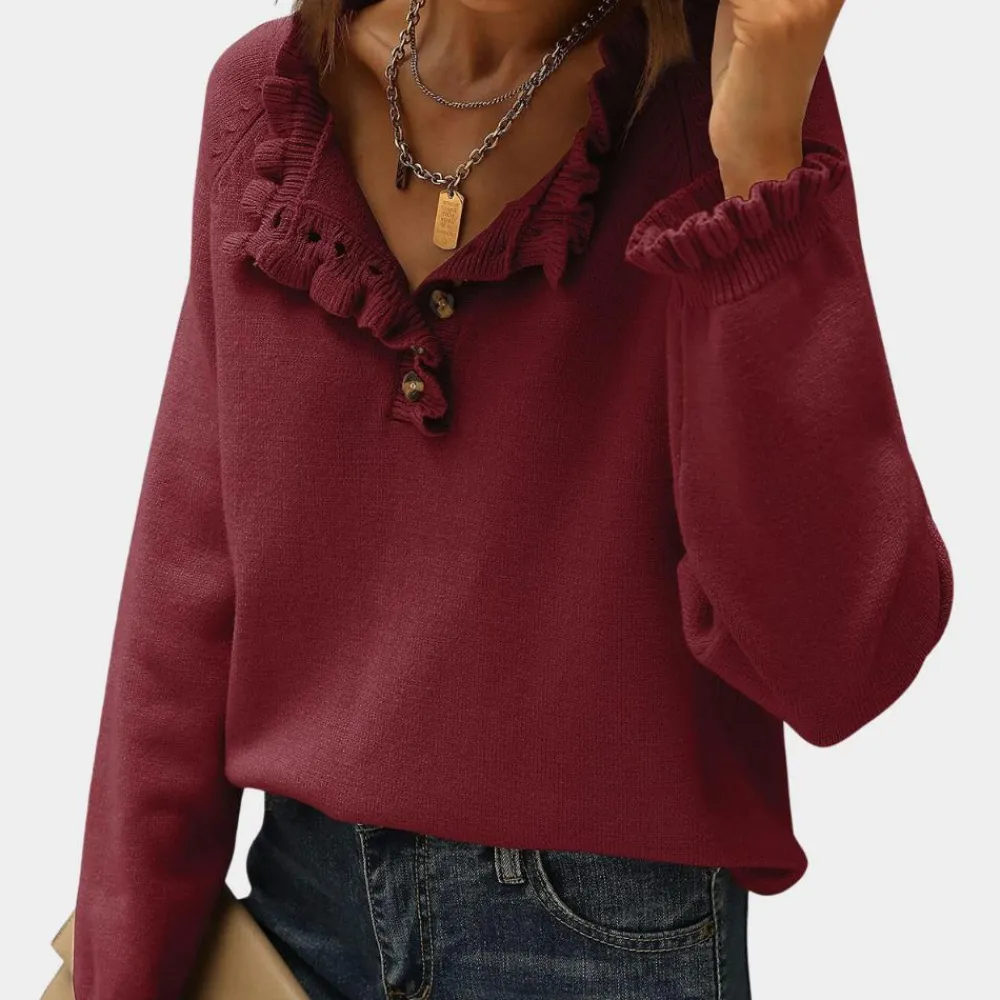 ANN – Moderne Trui voor Dames is een perfecte combinatie van elegantie en aantrekkingskracht. Met zijn verfijnde rimpeldetails langs de kraag en mouwen, voegt deze trui een vrouwelijk accent toe aan je dagelijkse outfit.
