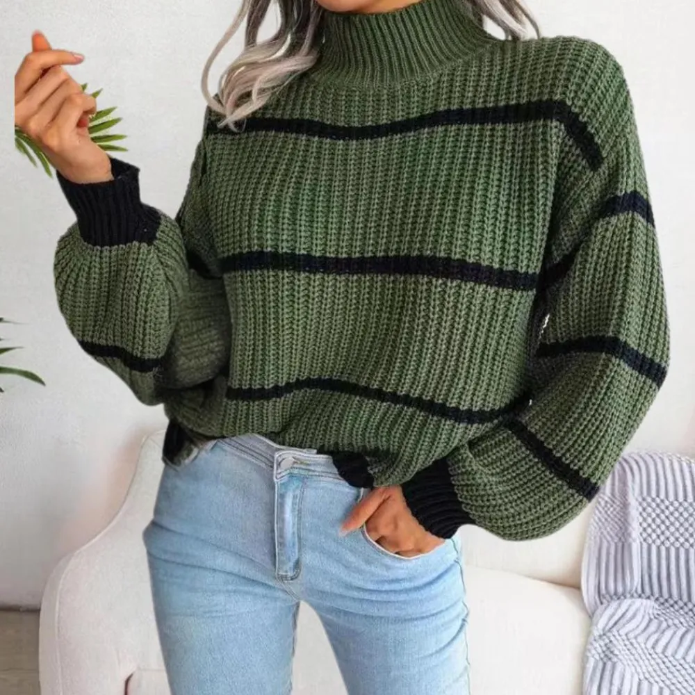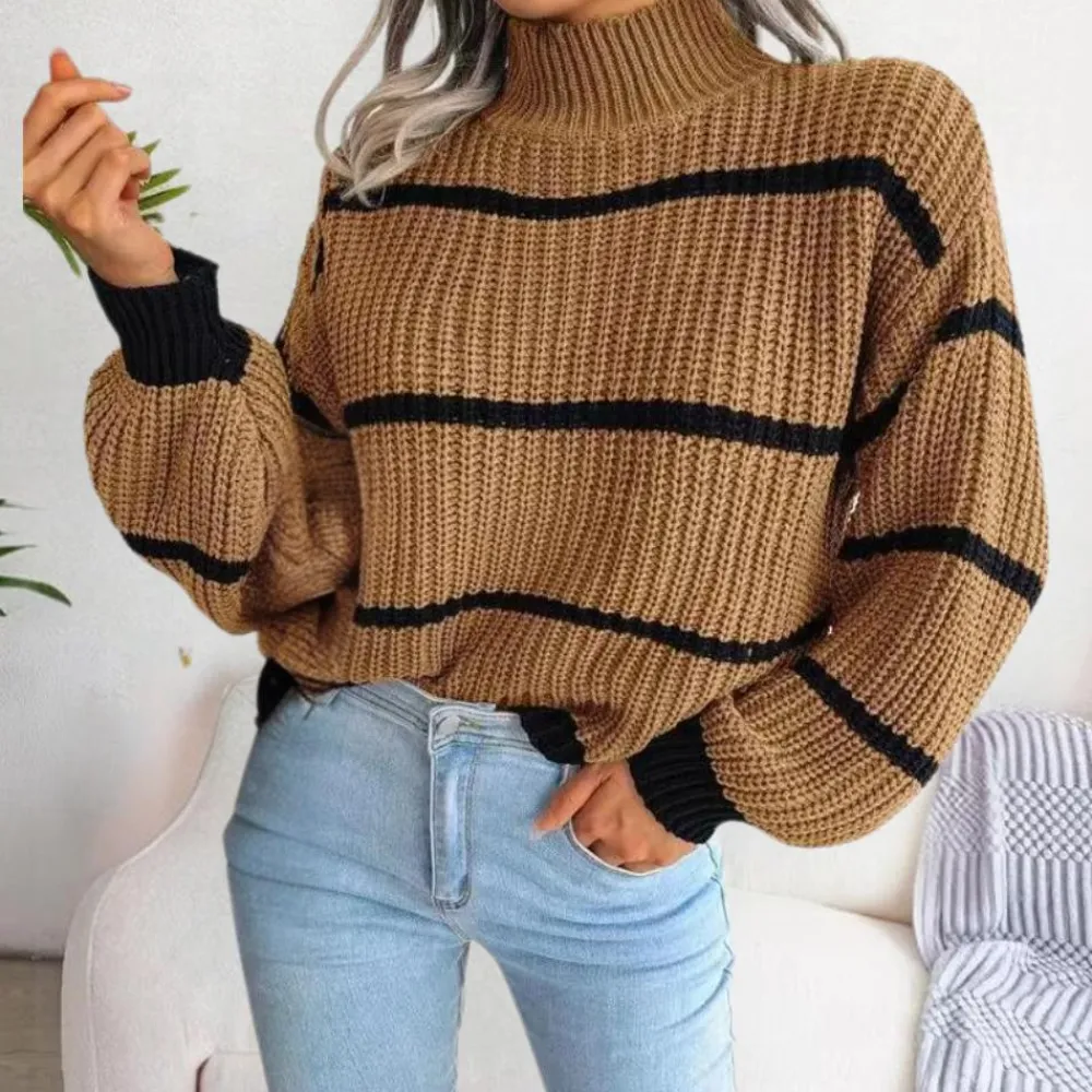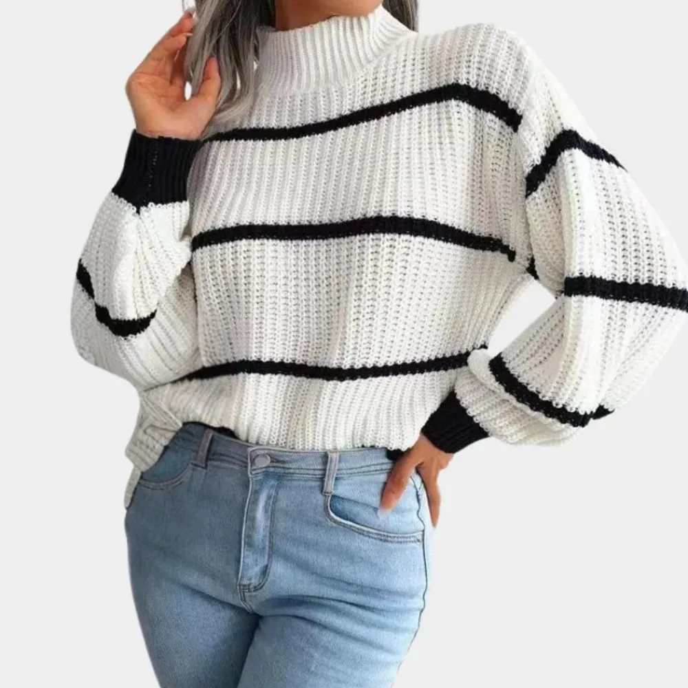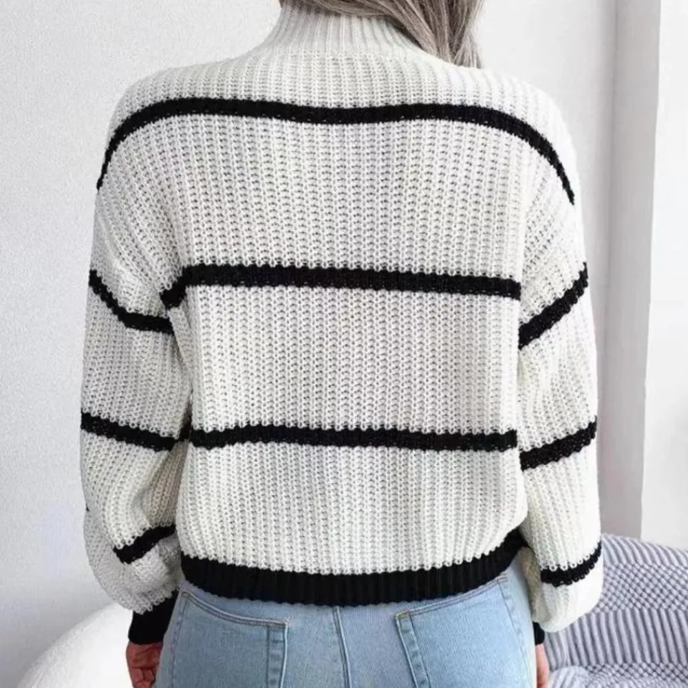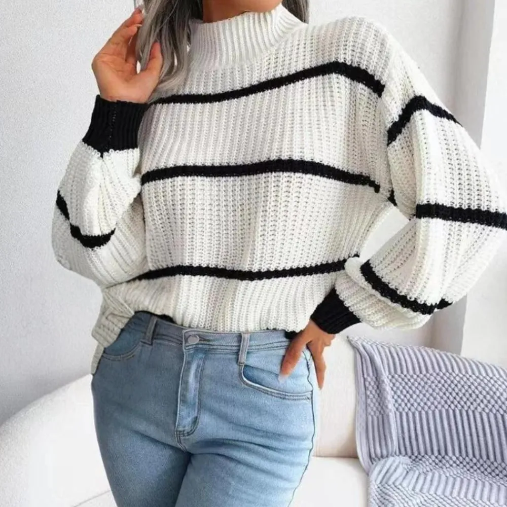 Geef je kledingstijl een upgrade met onze Celine Modieuze dames zachte trui met hoge hals. Deze trui met hoge hals heeft een opvallend zwart-wit gestreept patroon dat onmiddellijk in het oog springt. Ideaal voor de koelere dagen, is hij gemaakt van een zachte gebreide stof die zowel warmte als ademend vermogen biedt.