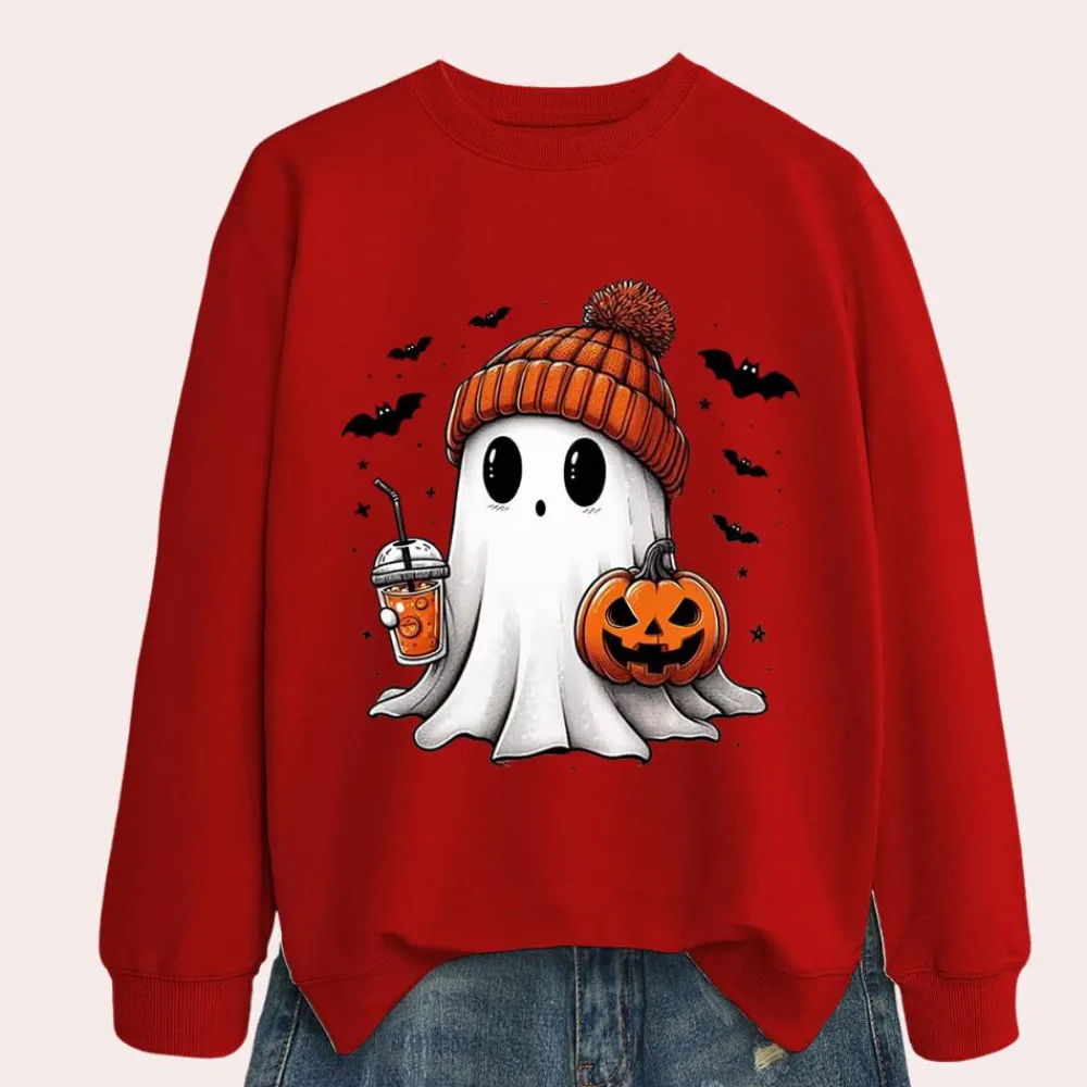Vier de herfst met de knusse Cintia Griezelig Halloween Sweatshirt voor Vrouwen, waarin een schattig spookje centraal staat met een muts op, een pompoendrank in de hand en een versierde pompoen erbij.