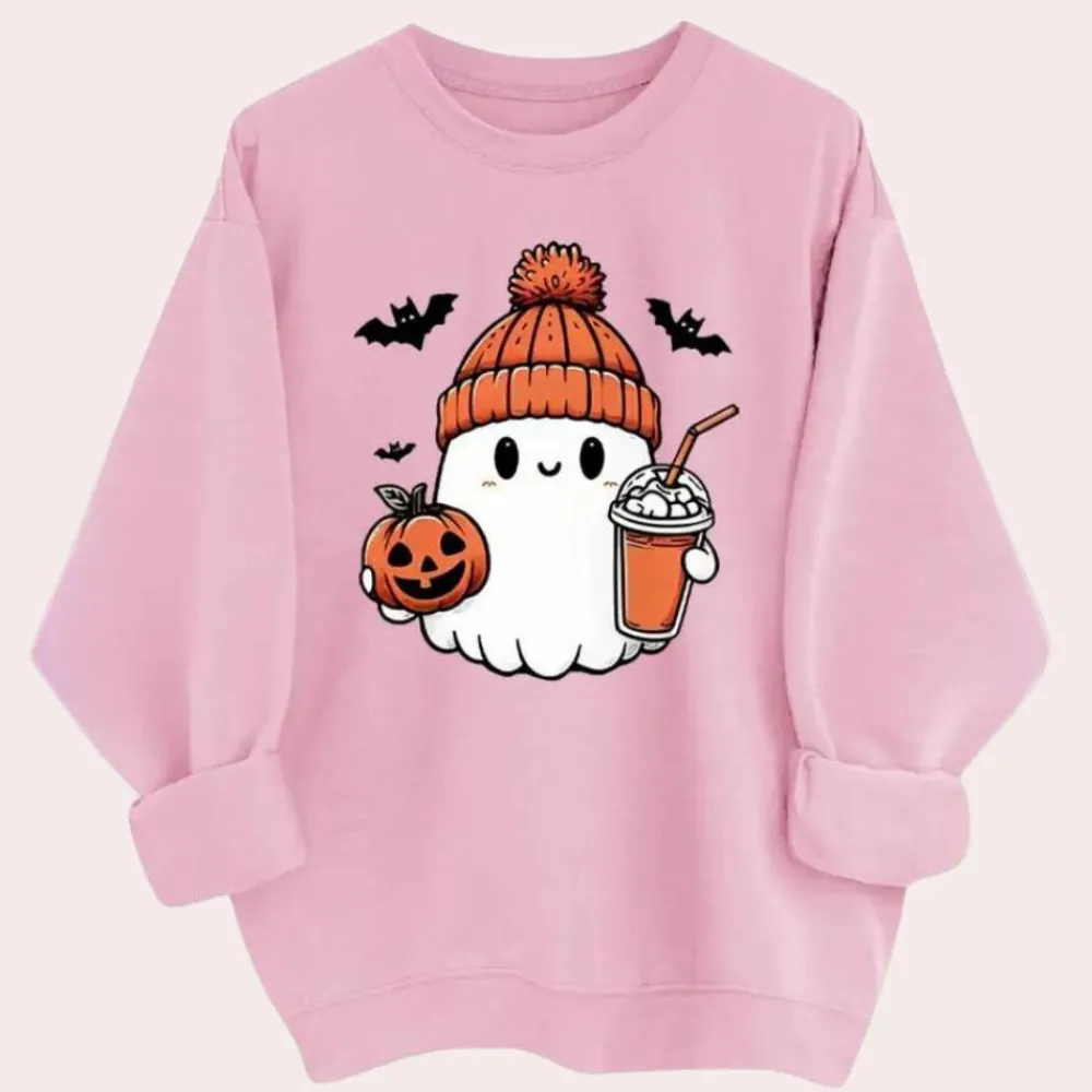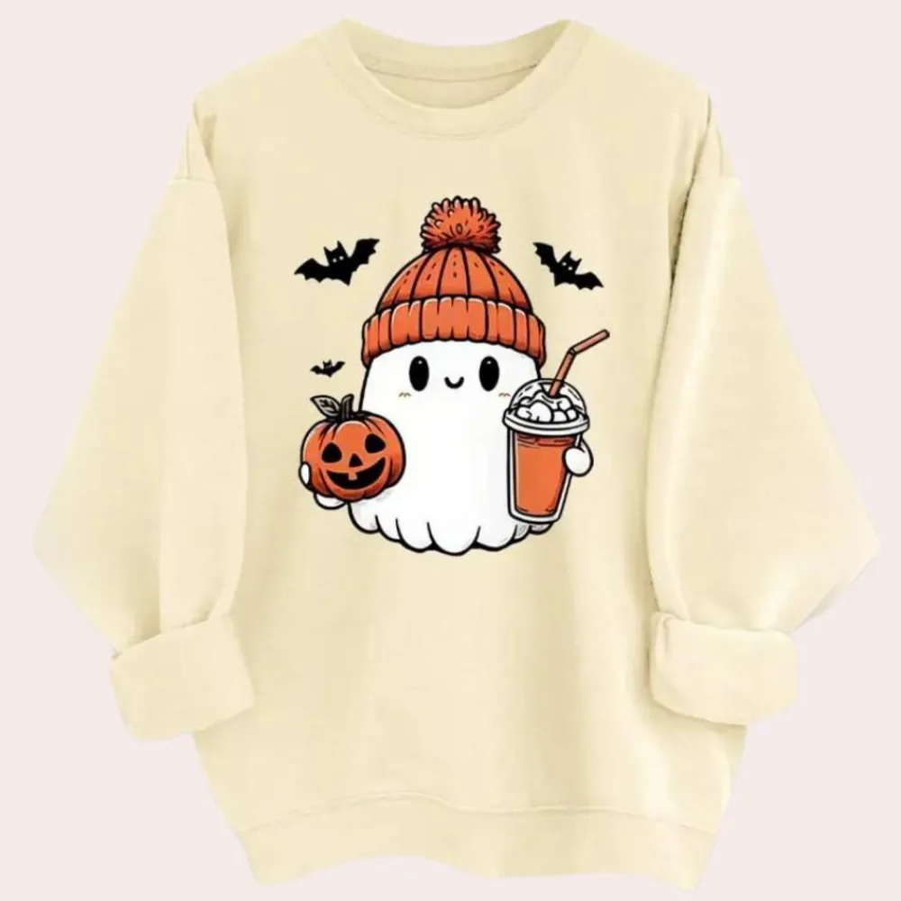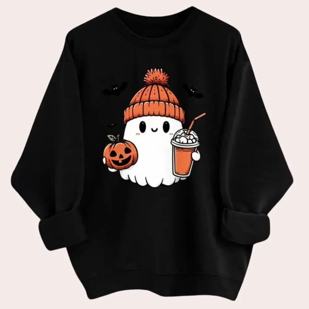 Voeg een speelse Halloween-touch toe aan je herfstgarderobe met het Dominika sweatshirt. Het ontwerp met een vriendelijke geest die een pompoen en een feestelijk drankje vasthoudt, geeft je outfits een humoristische en feestelijke uitstraling.