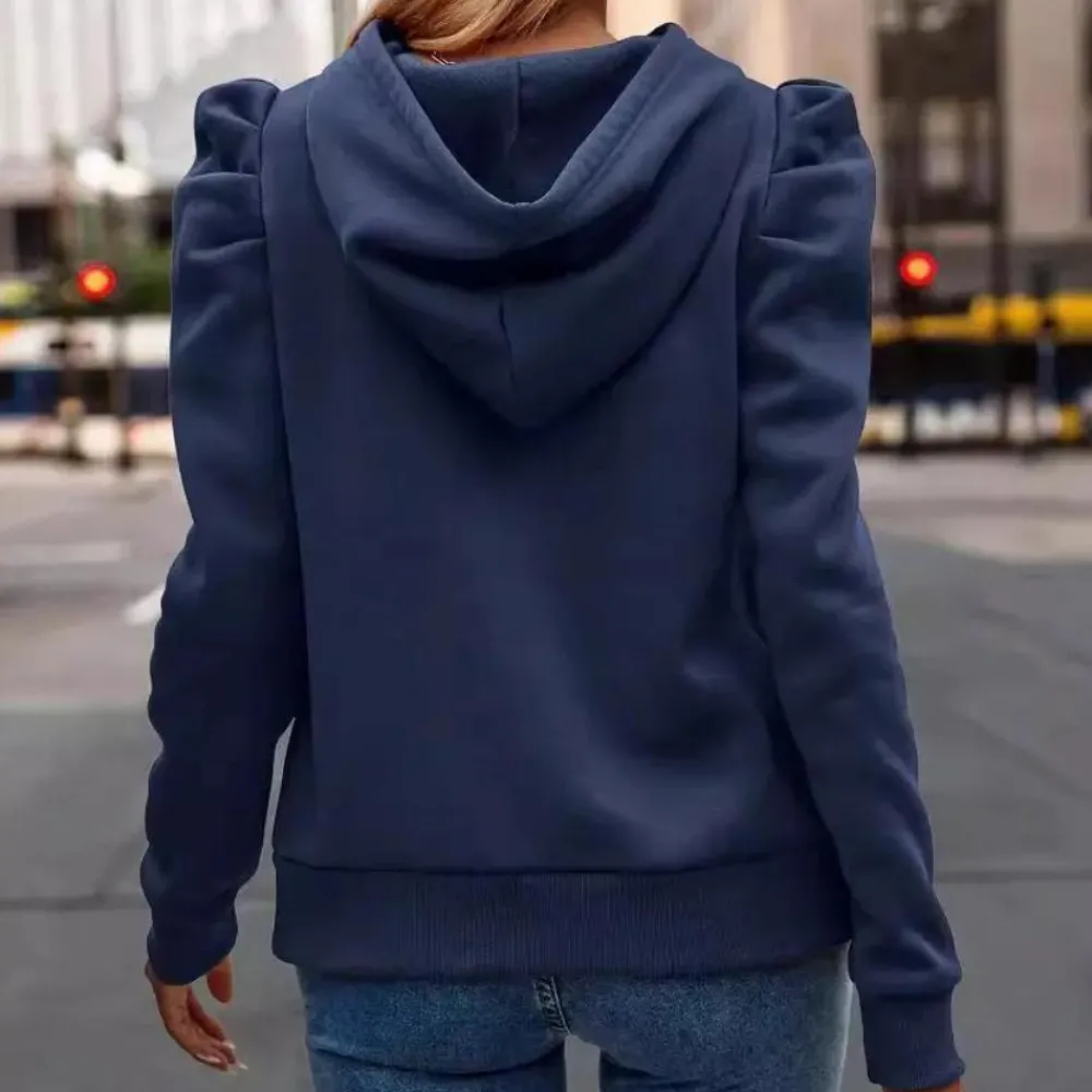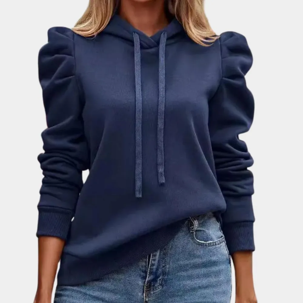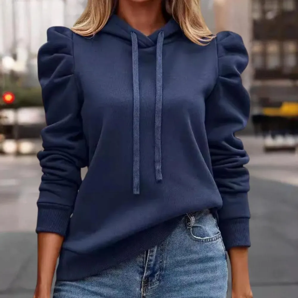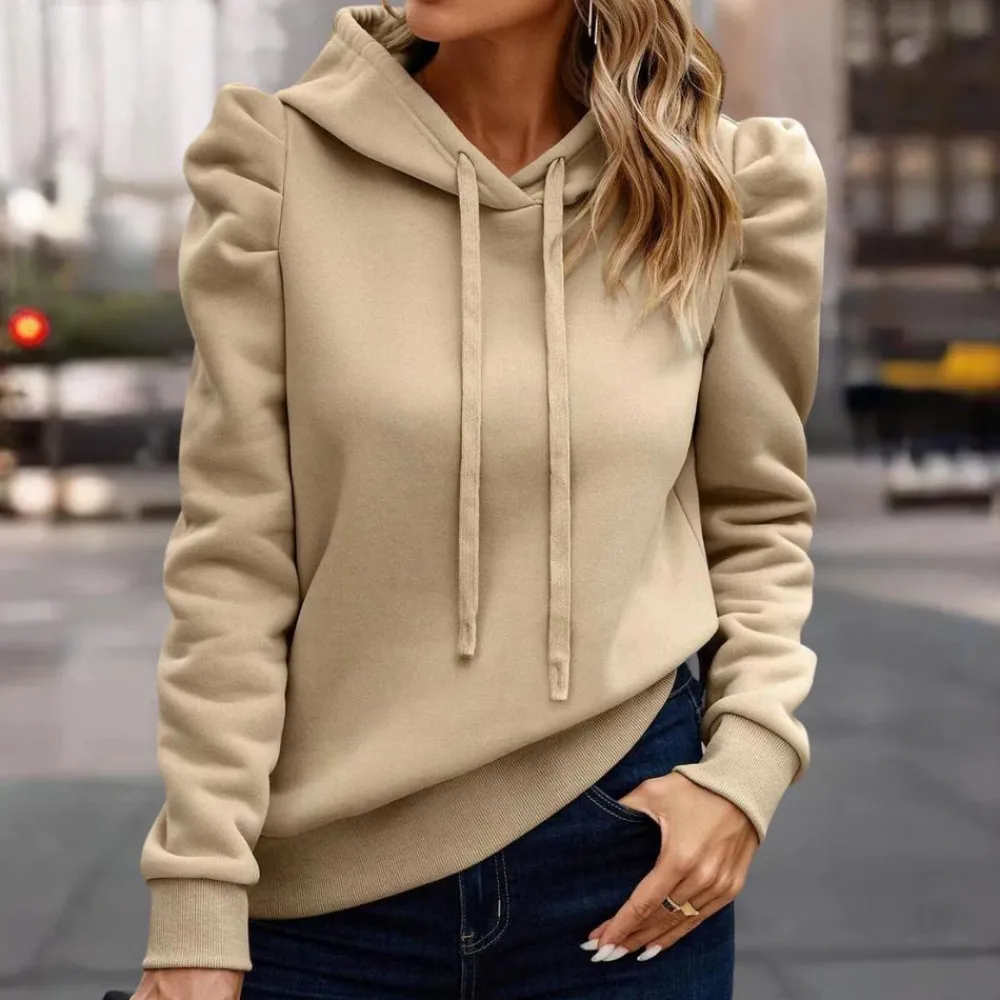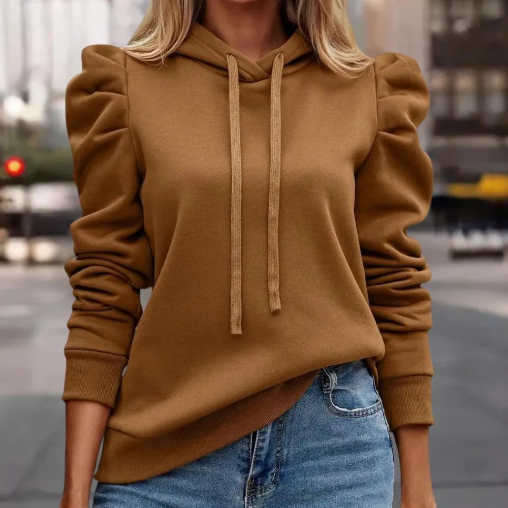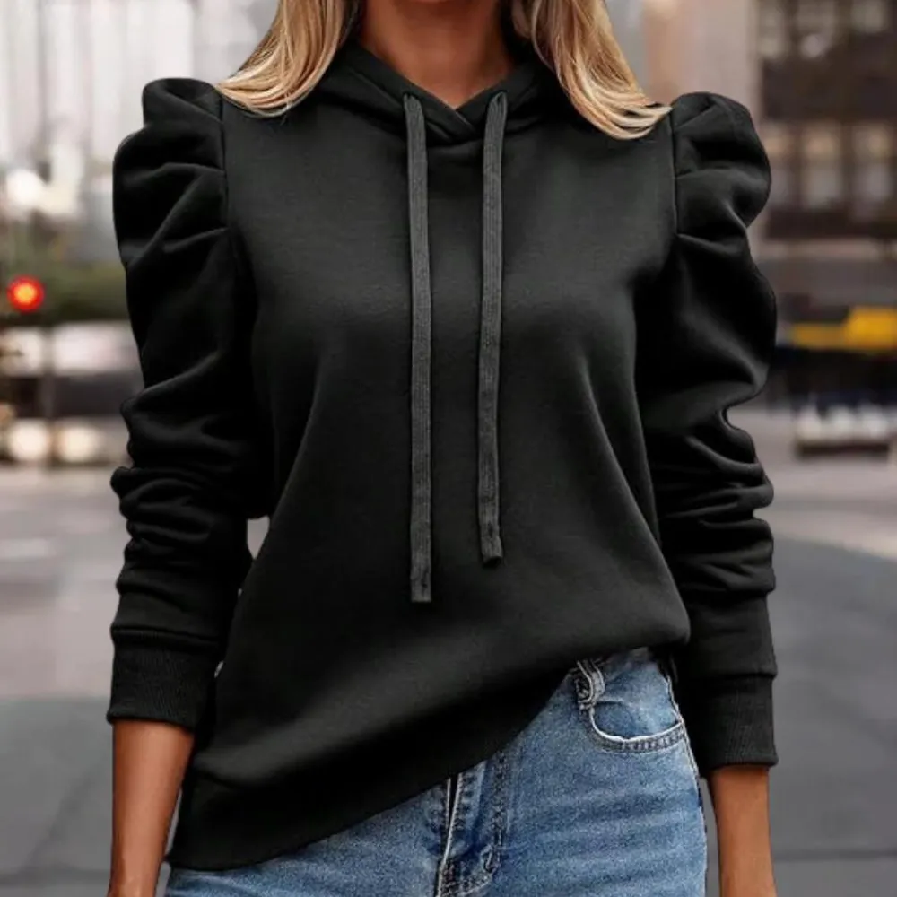 Deze veelzijdige hoodie heeft een trendy trekkoord en elegante pofmouwen, ideaal voor een moderne casual look.