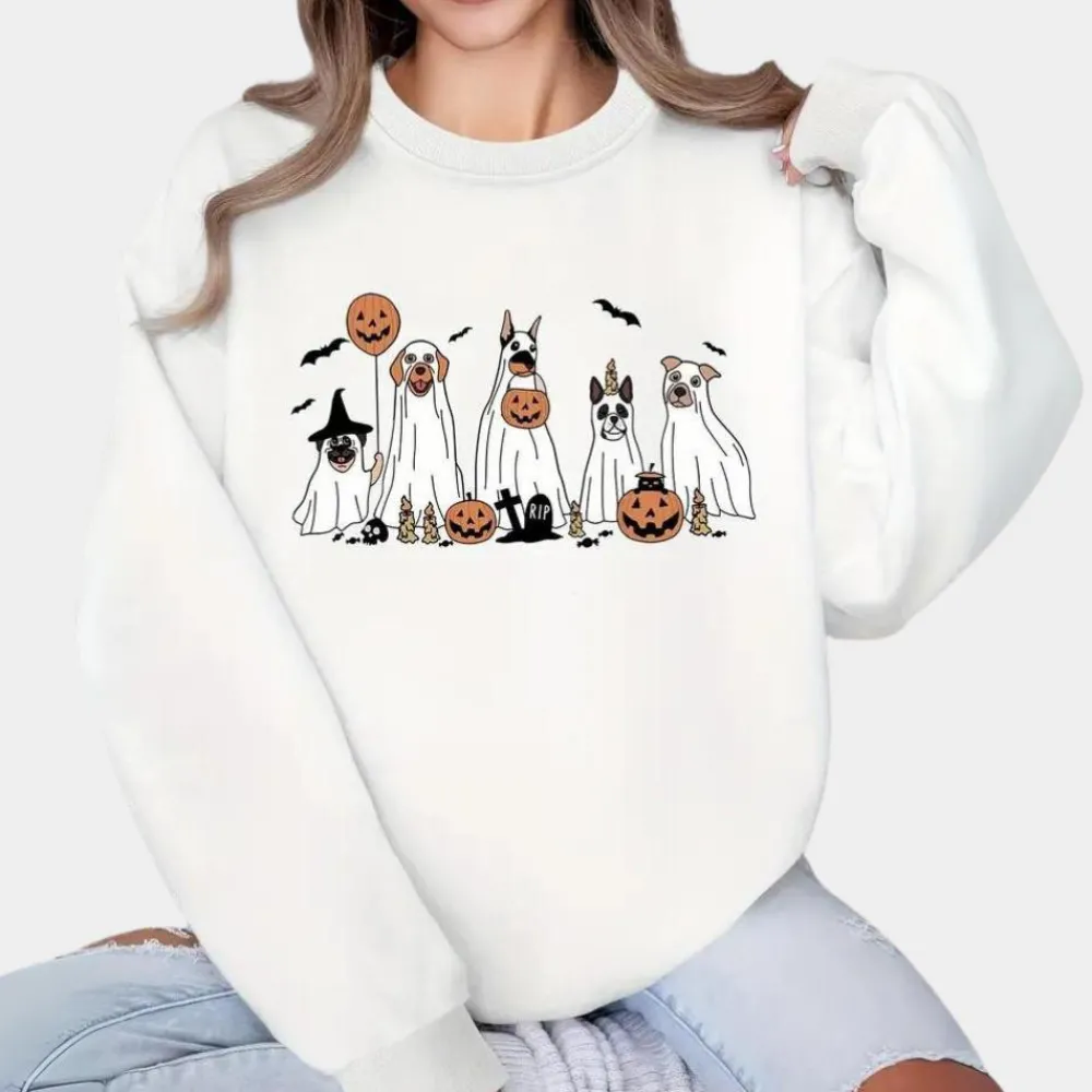 Verwelkom de Halloween-sfeer met de Margareta Damestrui voor Halloween met hondenprint, met een groep schattige honden die verkleed zijn als spoken en heksen. Deze trui is ideaal voor iedereen die van Halloween houdt, en het grappige hondontwerp zorgt gegarandeerd voor een glimlach.