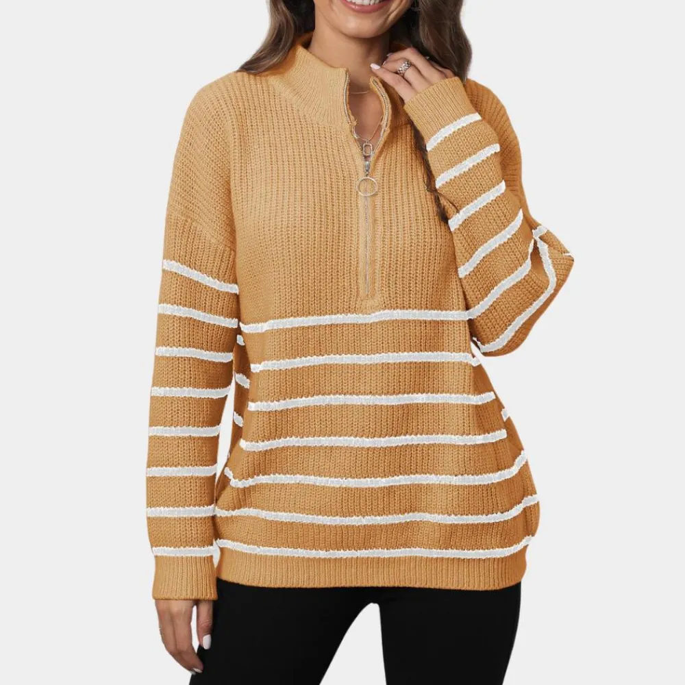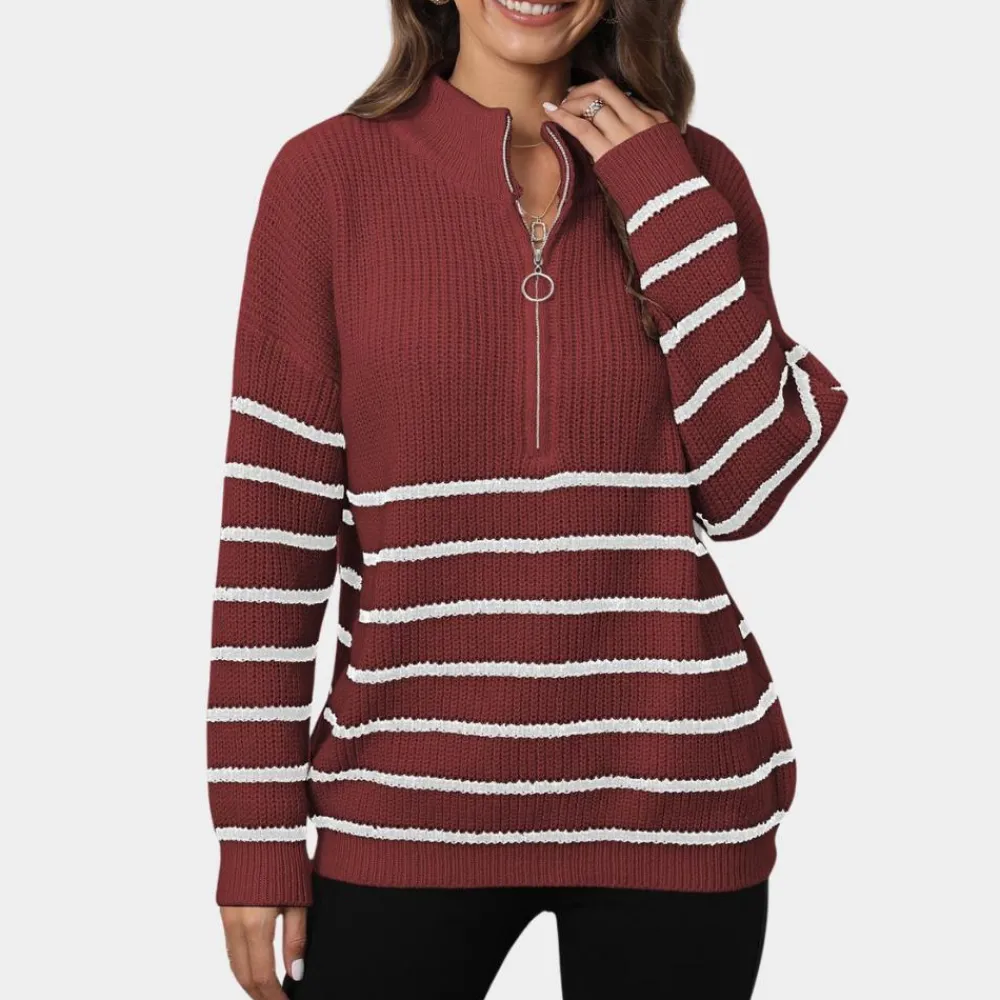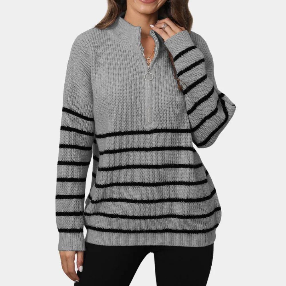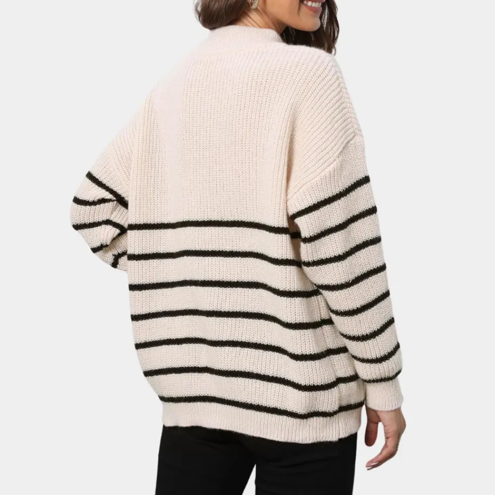 Blijf modieus en behaaglijk met onze Nydia Dames Casual Gestreept Gebreid Half Rits Trui. Het klassieke strepenpatroon en de V-hals maken deze trui perfect voor laagjes en voor het creëren van een modieuze look. Het zachte, warme materiaal maakt het een ideale keuze voor de winter. Geef je kledingkast een upgrade met deze stijlvolle trui!