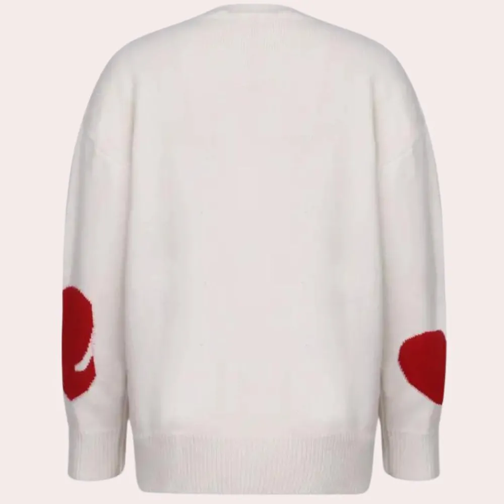 Met een levendig hartontwerp is deze trui perfect om je outfit op te fleuren en er tegelijkertijd modieus uit te zien. Of je nu een casual uitstapje maakt, een feestje viert of gewoon een vleugje plezier aan je dag wilt toevoegen, hij past moeiteloos bij jeans, rokken of broeken.