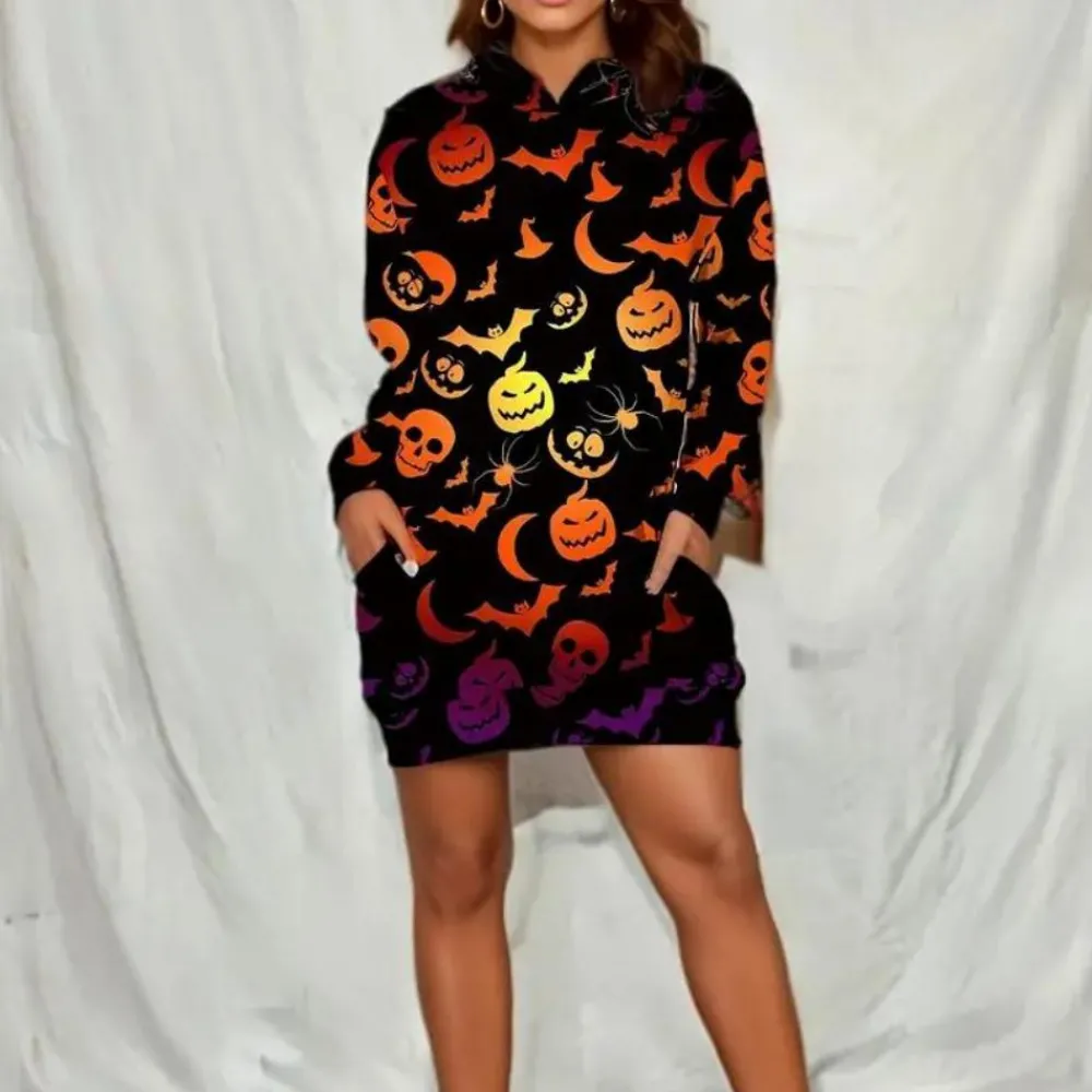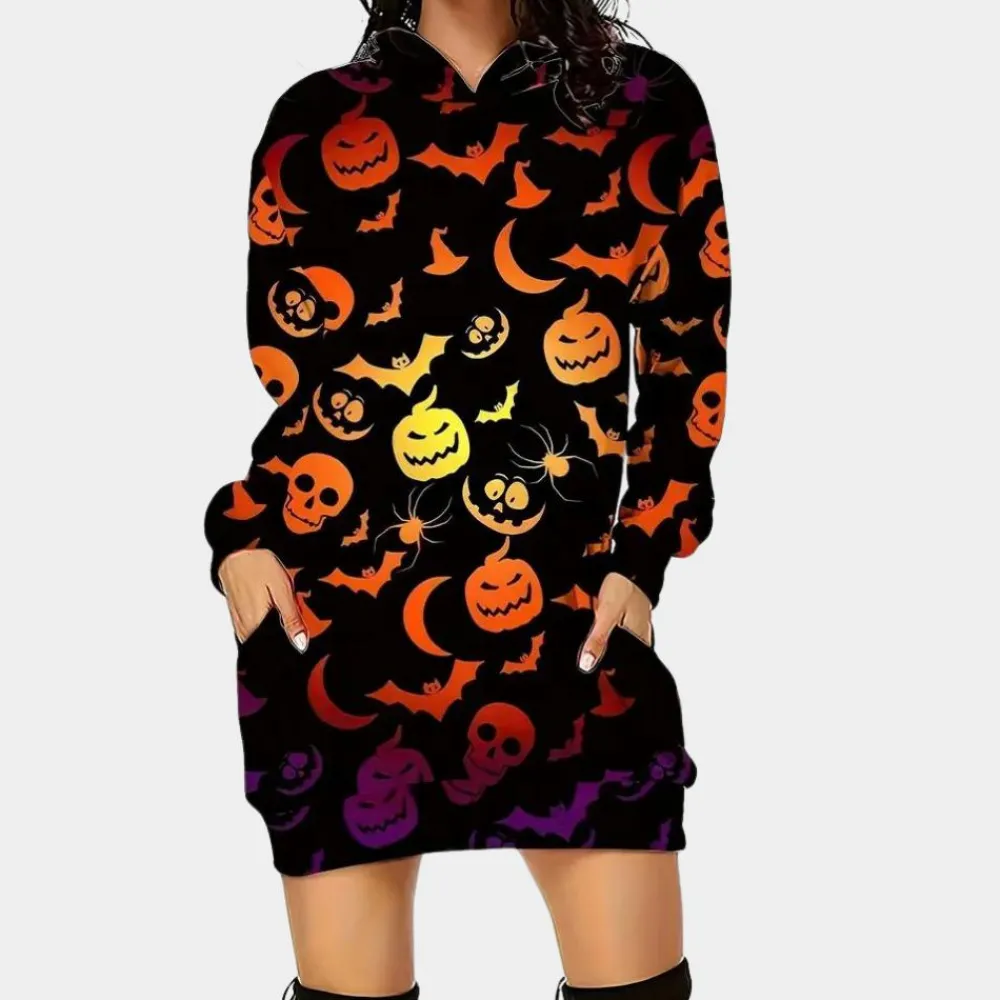 Deze sweaterjurk met capuchon en lange mouwen biedt warmte en comfort, perfect voor koude herfstdagen en gezellige Halloweenfeestjes. Dankzij de losse pasvorm en het modieuze ontwerp ben je verzekerd van zowel comfort als een flatterend silhouet.