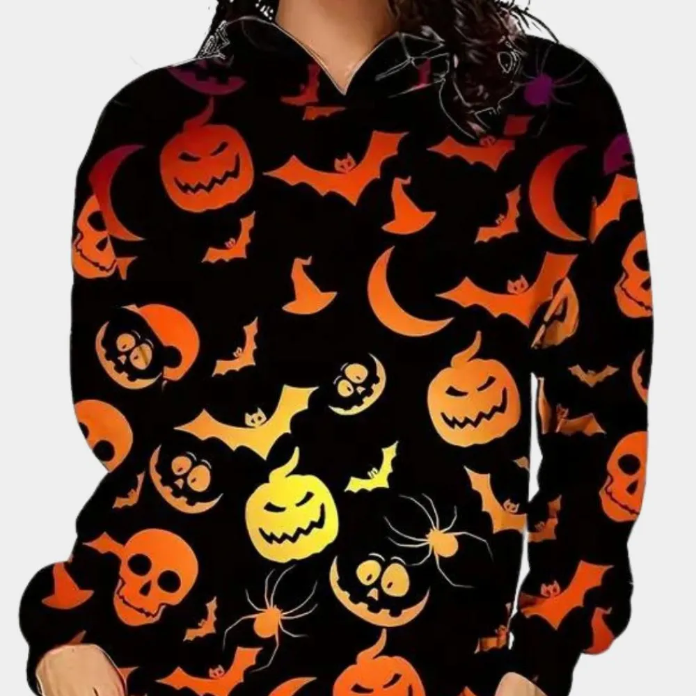 Haal het beste uit de Halloweenperiode met de Zsusanna Trendy dames halloween trui met capuchon, een combinatie van knus comfort en feestelijke flair. De kleurrijke print met Halloween-thema’s, zoals pompoenen, vleermuizen en schedels, brengt een vrolijke sfeer in je herfstoutfits.