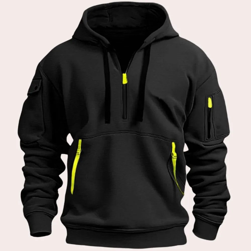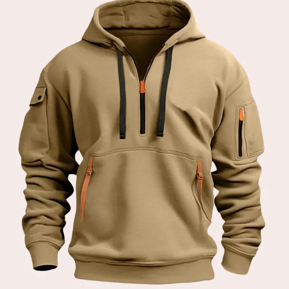 De Calin heren hoodie biedt de perfecte combinatie van mode en functionaliteit. Verkrijgbaar in de kleuren khaki, zwart, grijs en marineblauw, is deze ideaal voor elke man die comfort en stijl waardeert.