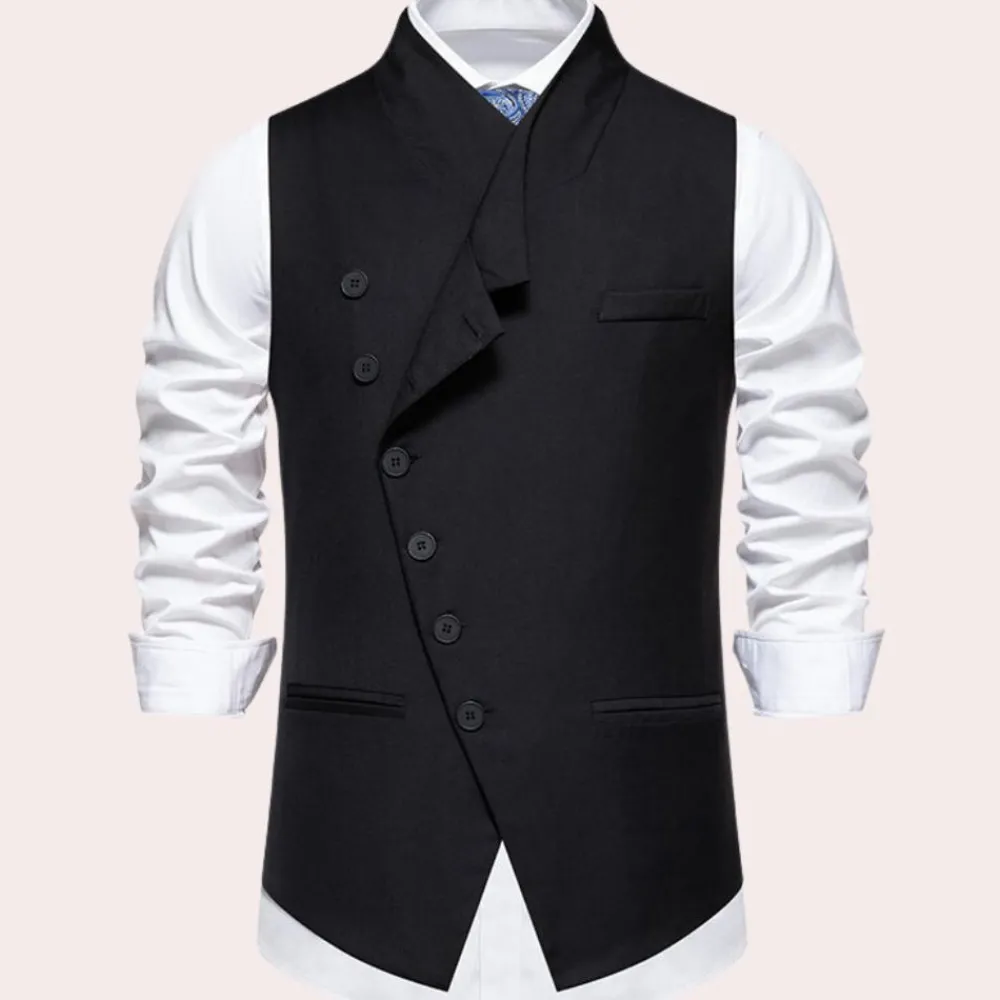 De Laszlo Elegant herenvest met asymmetrische sluiting kan zowel overdag als ’s avonds gedragen worden en past goed bij sneakers voor een casual uitstraling.